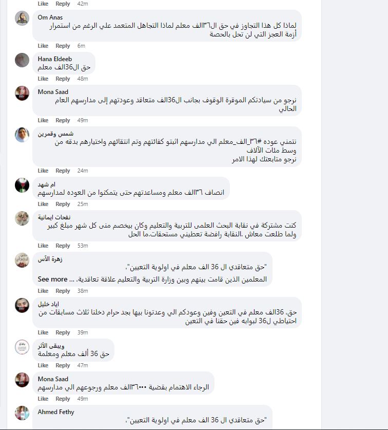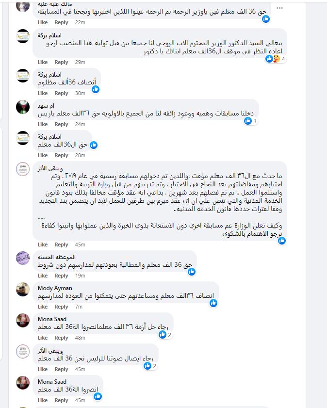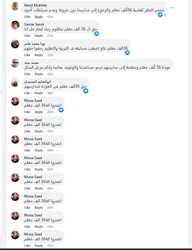 تصدرت مطالب نحو 36 ألف معلم؛ الصفحة الرسمية لوزارة التربية والتعليم، عبر مئات التعليقات وذلك في غضون دقائق، مُطالبين بسرعة إنهاء الإجراءات القانونية لعودة الـ 36 ألف معلم - متعاقد لمدارسهم، وحماية 36 ألف أسرة مصرية تنتظر قرار العودة، عقب اجتيازهم اختبارات المسابقة الرسمية للتعيين.