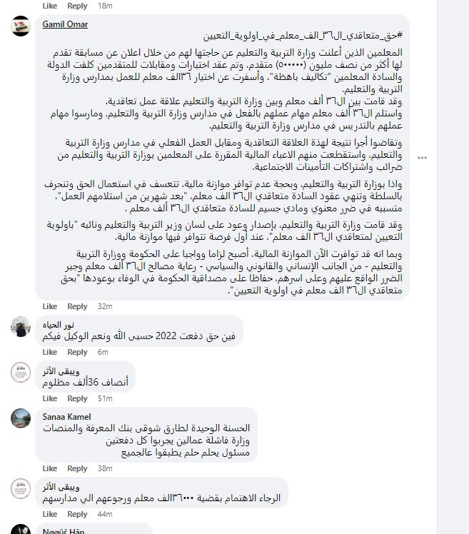 وعلّق جميل عمر، عبر صفحة الوزارة، قائلا: بعد استلام الـ 36 ألف معلم؛ مهام عملهم بالفعل في مدارس وزارة التربية والتعليم، ومارسوا مهام عملهم بالتدريس في مدارس وزارة التربية والتعليم، وتقاضوا أجورا بناء على تعاقدهم مع الوزارة، لكن الوزارة أنهت عُقودهم بدعوى عدم توافر ميزانية، موضحا: بعد تولي الدكتور رضا حجازي وزارة التربية والتعليم؛ أصبح واجبا على ووزارة التربية والتعليم رعاية مصالح الـ 36 ألف معلم وجبر الضرر الواقع عليهم وعلى أسرهم، حفاظًا على الوفاء بحق متعاقدي الـ 36 ألف معلم في أولوية التعيين.
