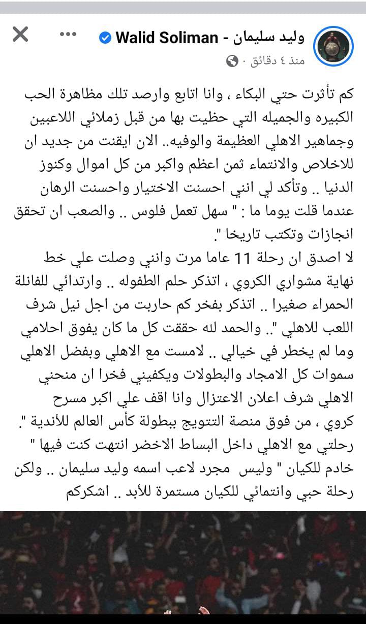 واختتم وليد سليمان: رحلتي مع الأهلي داخل البساط الأخضر انتهت كنت فيها خادم للكيان، وليس مجرد لاعب اسمه وليد سليمان، ولكن رحلة حبي وانتمائي للكيان مستمرة للأبد، أشكركم.