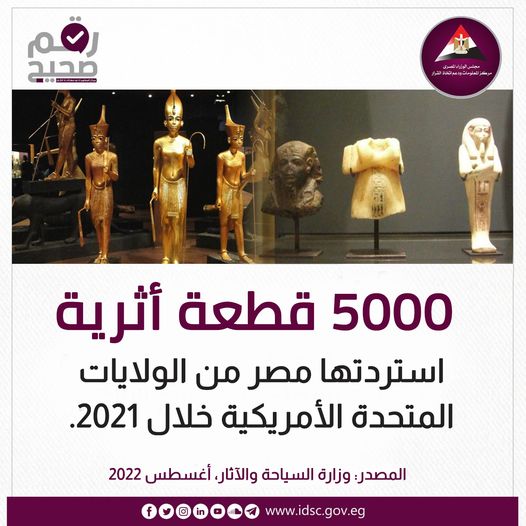 نشر مركز المعلومات التابع إلى مجلس الوزراء، إنفوجراف، سلط الضوء من خلاله على استرداد 5000 قطعة أثرية من الولايات المتحدة الأمريكية خلال عام 2021
