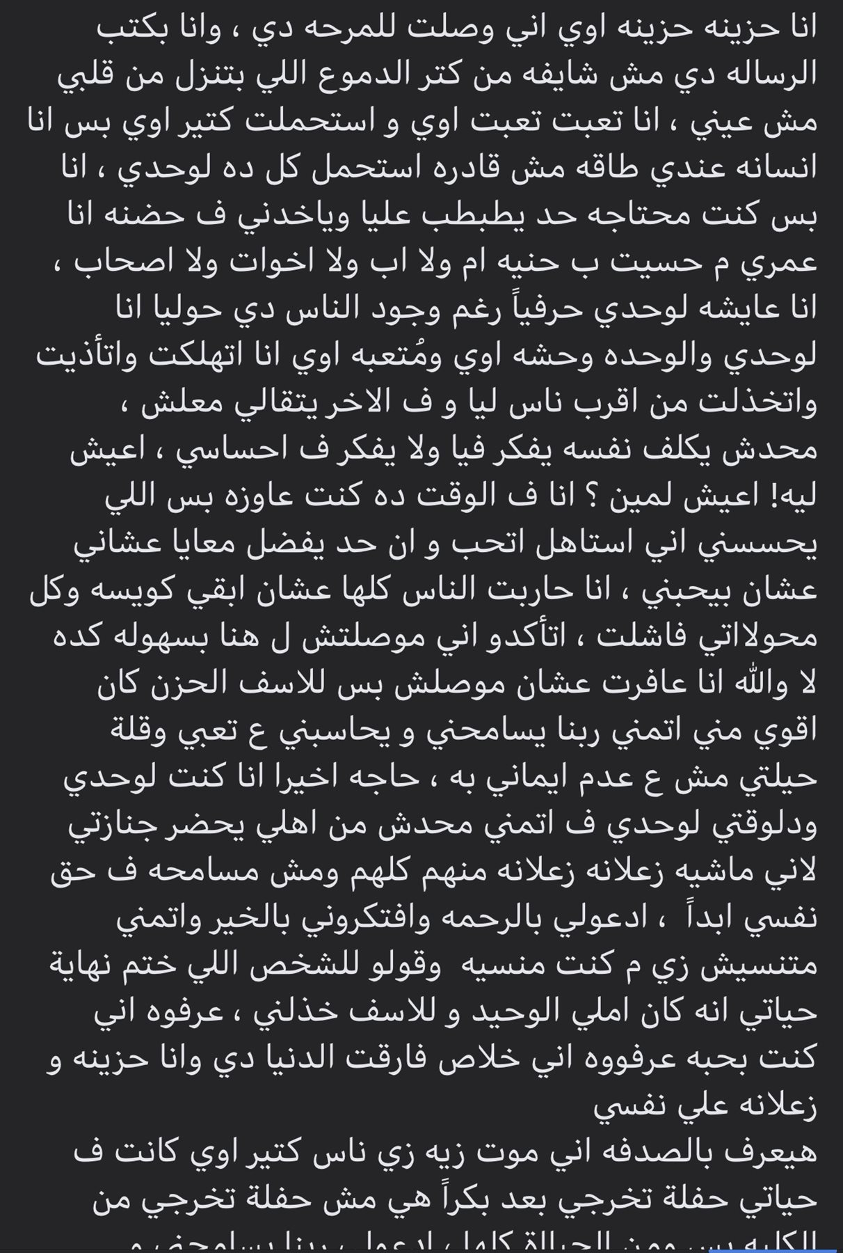وختمت رسالتها: هيعرف بالصدفة أني موت زيه زي ناس كتير أوي، كانت فحياتي، حفلة تخرجي بعد بكره هي مش حفلة تخرجي من الكلية بس، ومن الحياة كلها، أدعولي ربنا يسامحني ومحدش يقولي ماتت كافرة لأن الكُفر هو إني أفضل عايشة مأذية ومنسية ووحيدة.