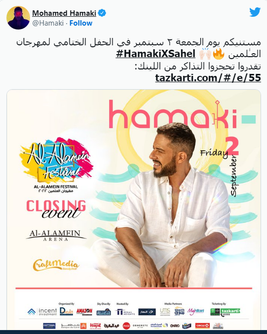 وكان محمد حماقي، روج للحفل عبر حسابه الشخصي بموقع تويتر، وشارك متابعيه، البوستر الرسمي للحفل وعلق عليه قائلًا: مستنيكم يوم الجمعة 2 سبتمبر في الحفل الختامي لمهرجان العلمين تقدروا تحجزوا التذاكر من اللينك المرفق.