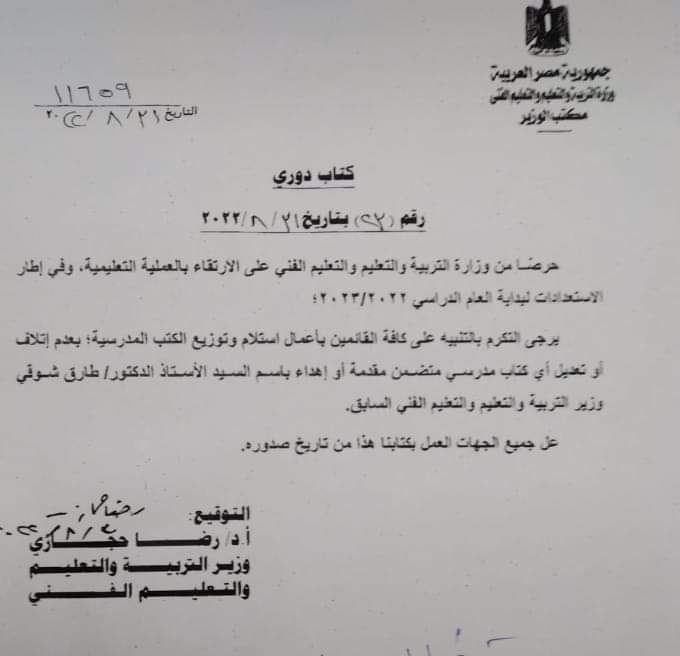 ونص الكتاب الدوري على أنه يرجى التنبيه على كافة القائمين بأعمال استلام وتوزيع الكتب المدرسية، بعدم إتلاف أو تغير أي كتاب مدرسي متضمن مقدمة أو إهداء باسم الدكتور طارق شوقي وزير التربية والتعليم والتعليم الفني السابق، وعلى جميع الجهات العمل بكتابنا هذا من تاريخ صدوره.