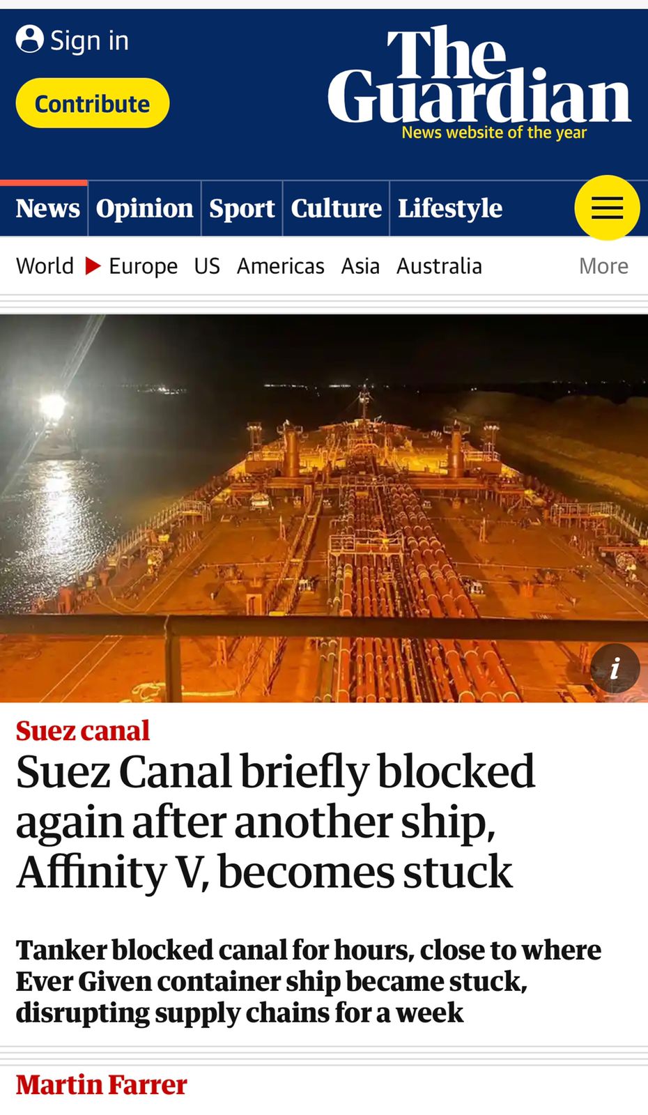 وجنحت ناقلة البترول AFFINITY في ميناء قناة السويس، مساء الأربعاء، تحمل علم سنغافورة، وذلك على غرار ما حدث مع السفينة البنمية إيفرجيفن.