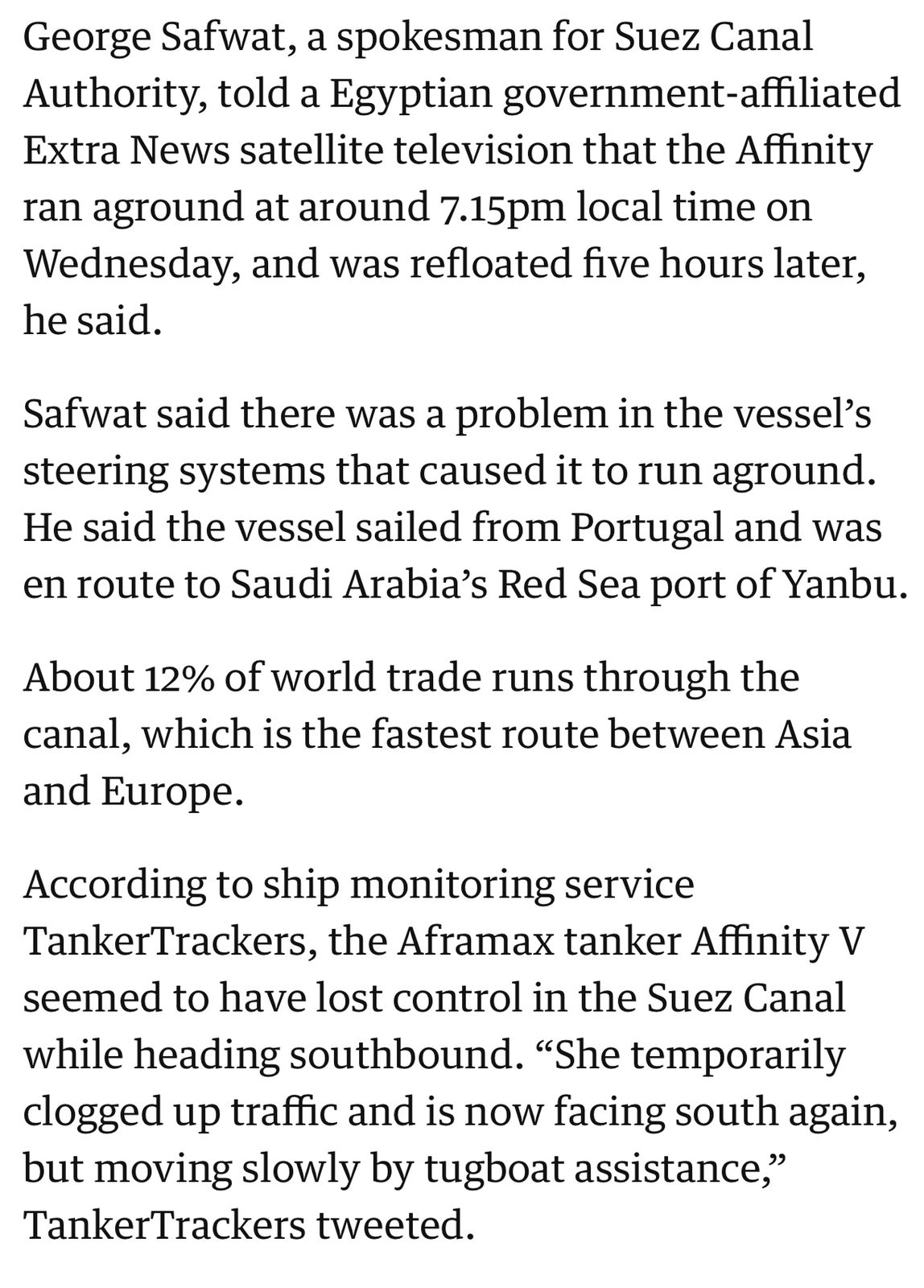 وبحسب موقع vesselfinder لتتبع حركة السفن، جنحت السفينة التي تحمل اسم Affinity V، وبطول 252 مترًا بالقرب من تقاطع مجرى قناة السويس مع مجرى قناة السويس.
