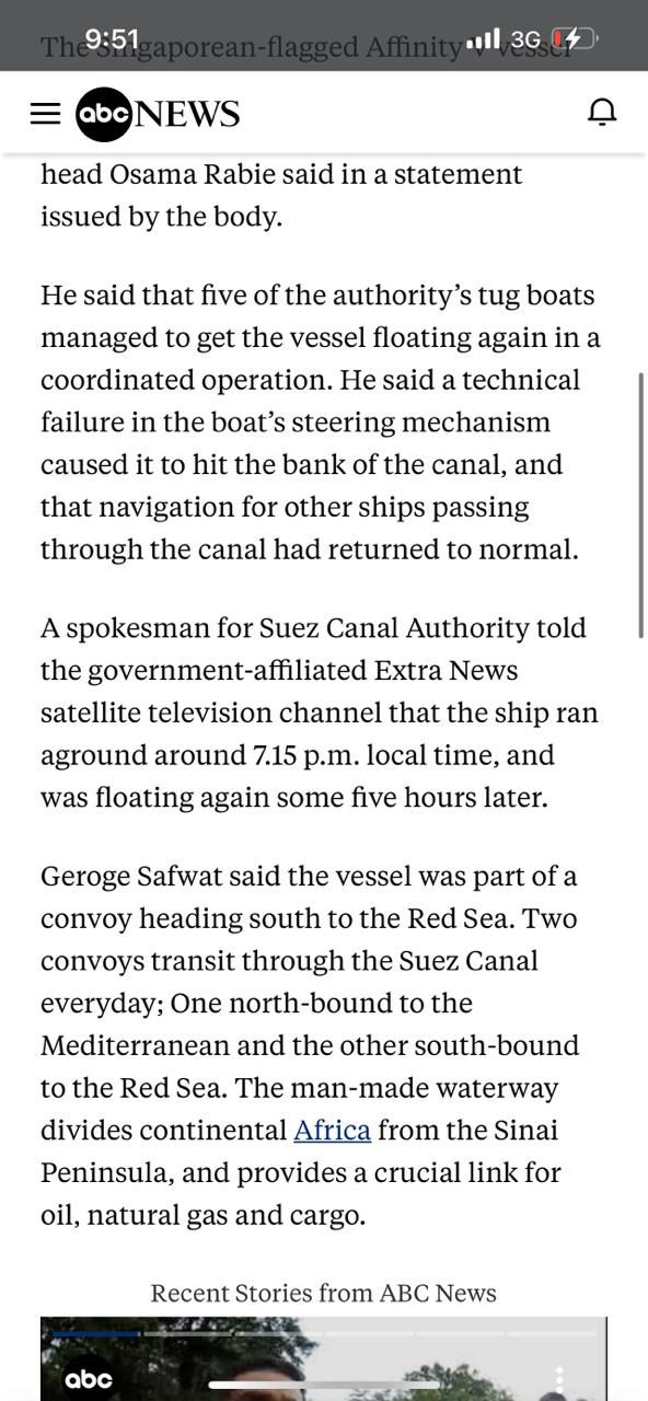وفي السياق ذاته، أعلن الفريق أسامة ربيع، رئيس هيئة قناة السويس، في بيان له، اليوم الخميس، أسباب جنوح ناقلة البترول AFFINITY في الممر الملاحي، بعد نجاح فريق الهيئة من تعويمها مرة أخرى، منّوها بأن عطلا فنيا بدفة السفينة نتج عنه فقدان القدرة على توجييها؛ ما أدى لجنوحها بالممر الملاحي.