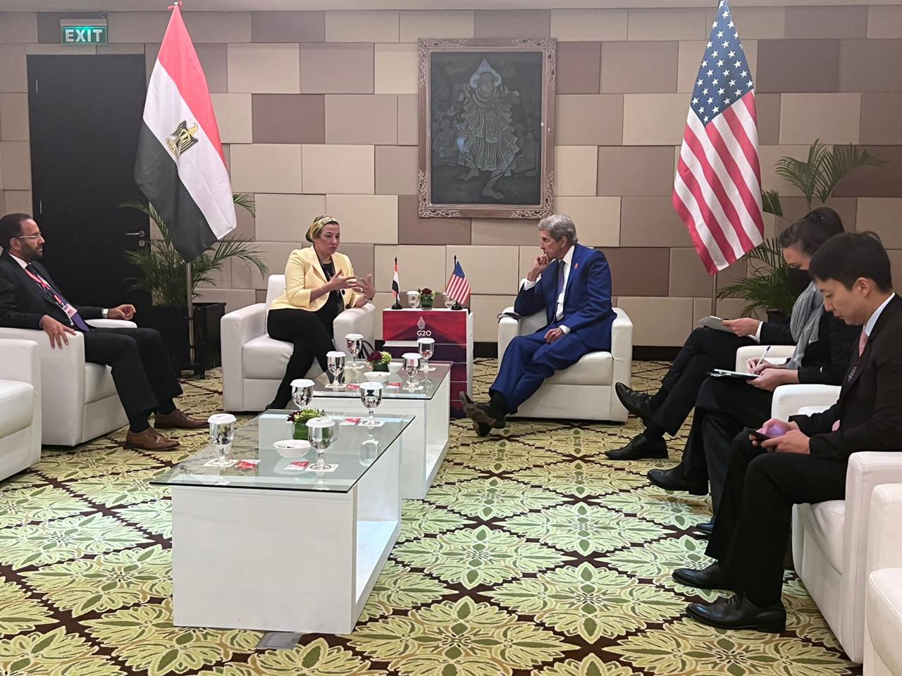 التقت الدكتورة ياسمين فؤاد وزيرة البيئة، المنسق الوزاري ومبعوث مؤتمر المناخ COP27 وجون كيري المبعوث الرئاسي الأمريكي الخاص بشئون المناخ، لبحث أوجه التعاون المشترك بين مصر وأمريكا، فى ظل استعدادات مصر لاستضافة مؤتمر المناخcop27 بمدينة شرم الشيخ نوفمبر المقبل، وذلك على هامش مشاركتها فى اجتماع وزراء البيئة والمناخ بمجموعة العشرين المنعقد بإندونيسيا بحضور السفير أيمن ثروت ممثل وزارة الخارجية والدكتور عمرو أسامة مستشار وزيرة البيئة للتغيرات المناخية.