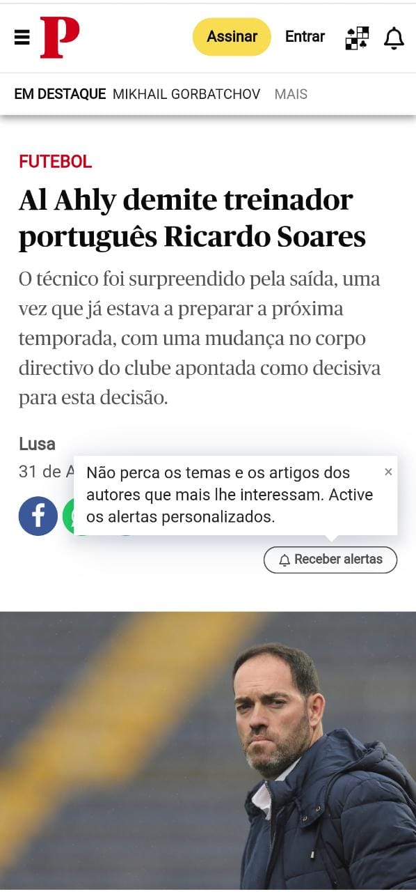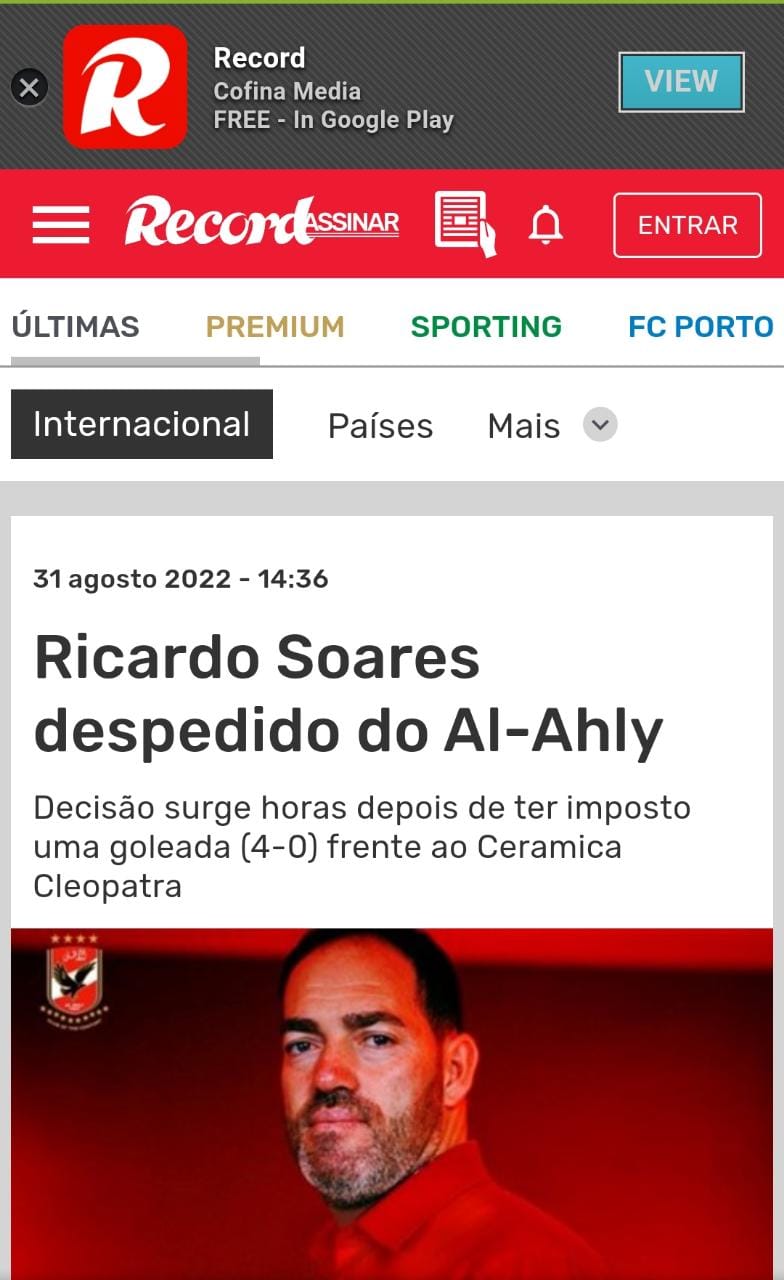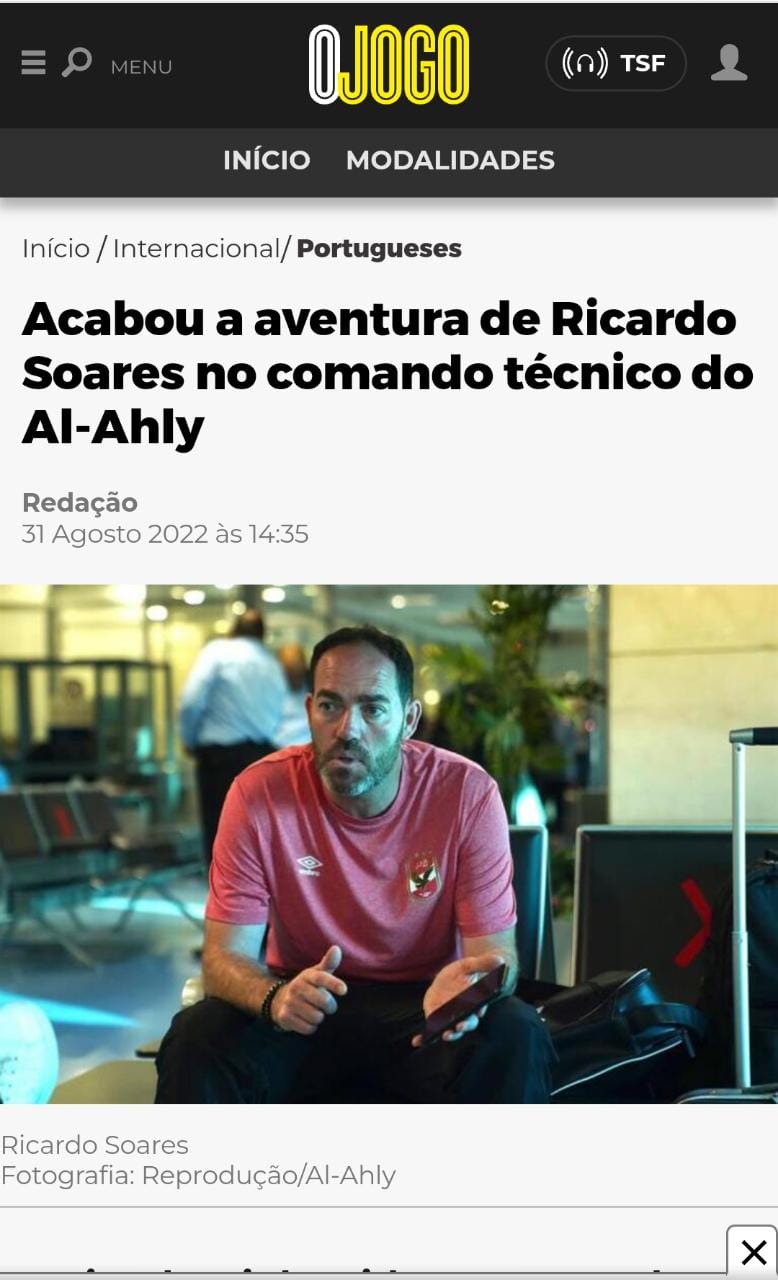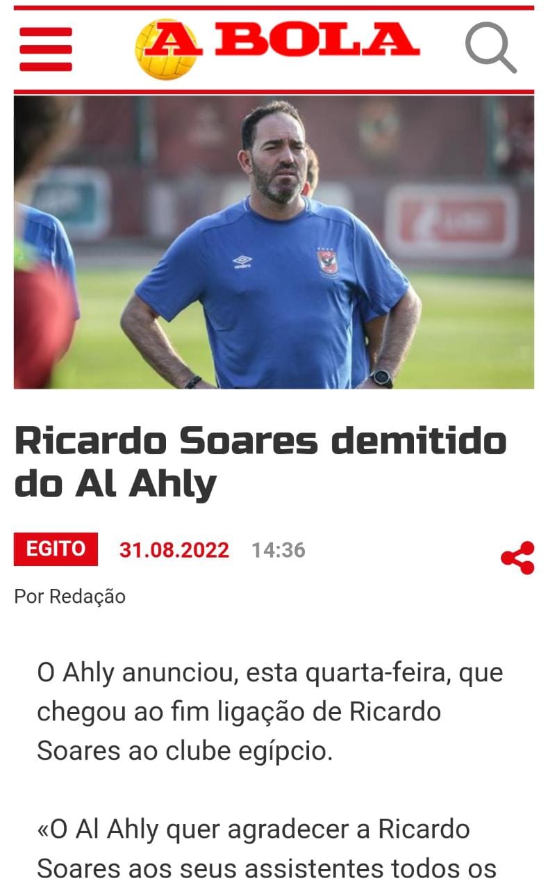 تناولت الصحف البرتغالية، قرار مجلس إدارة النادي الأهلي برئاسة محمود الخطيب، بإقالة البرتغالي ريكاردو سواريش المدير الفني للفريق الأحمر من منصبه.