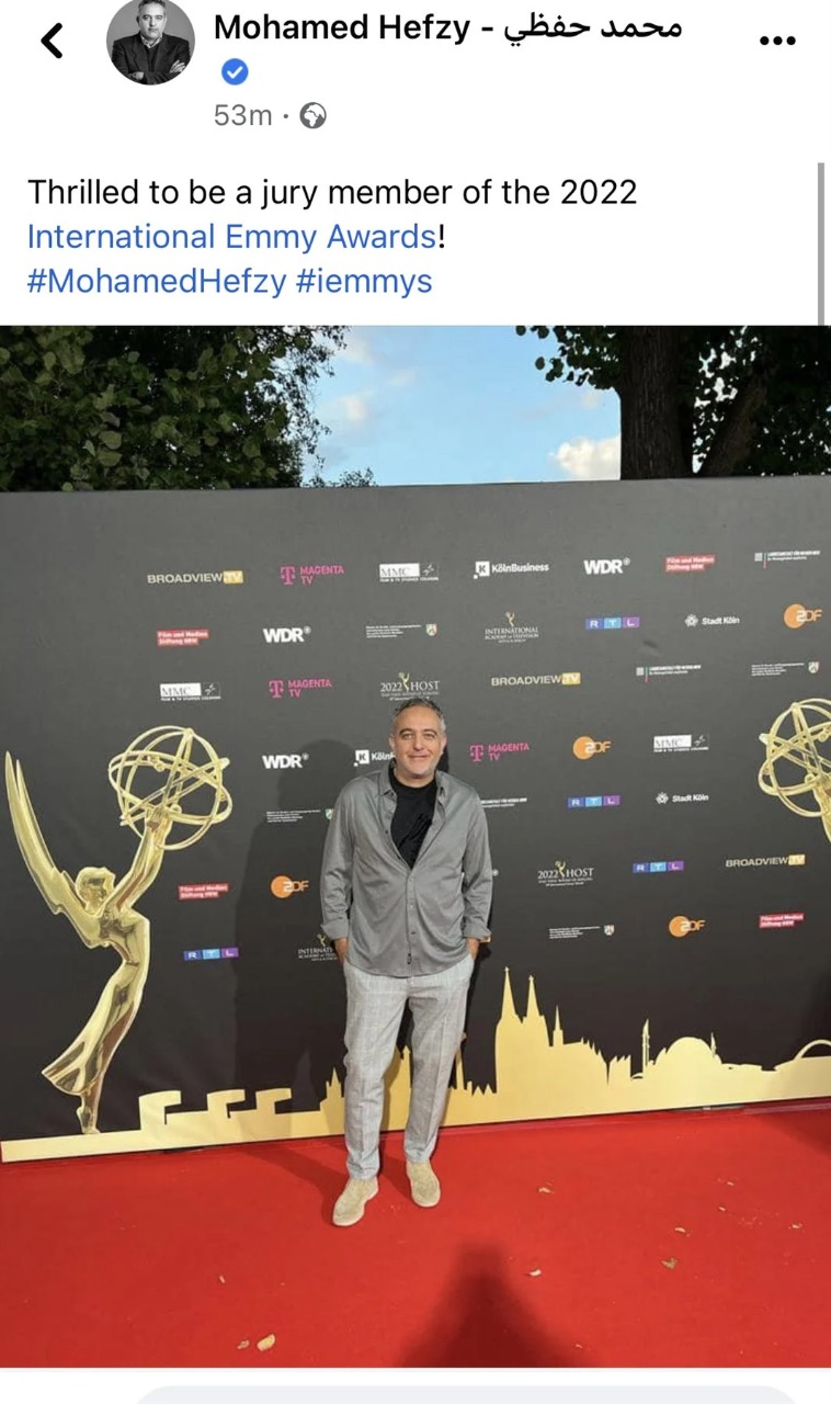 ونشر محمد حفظي، صوره له من خلال حسابه الرسمي على فيسبوك، وعلق قائلًا: يسعدني أن أكون عضوًا في لجنة التحكيم لجوائز إيمي الدولية لعام 2022.