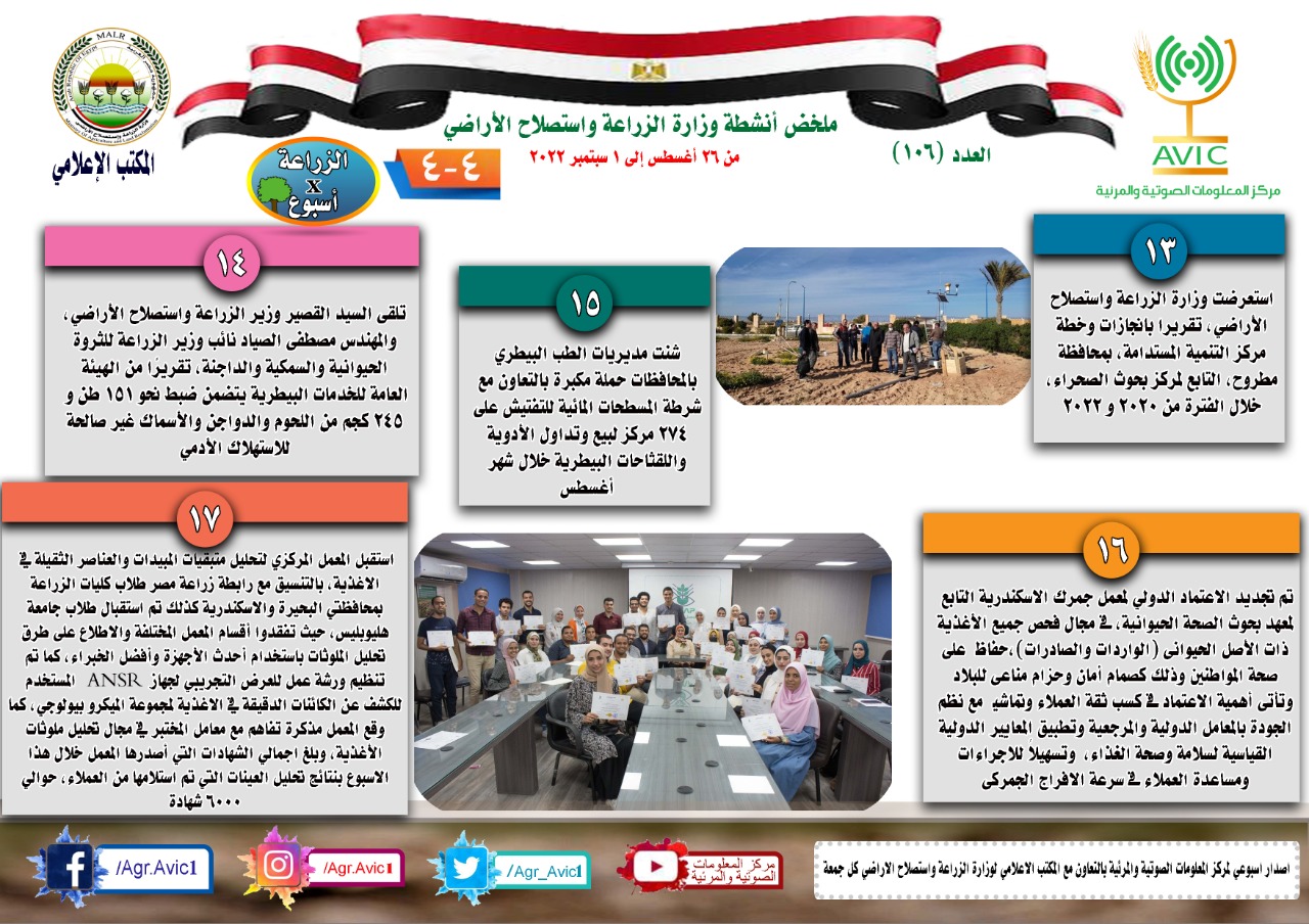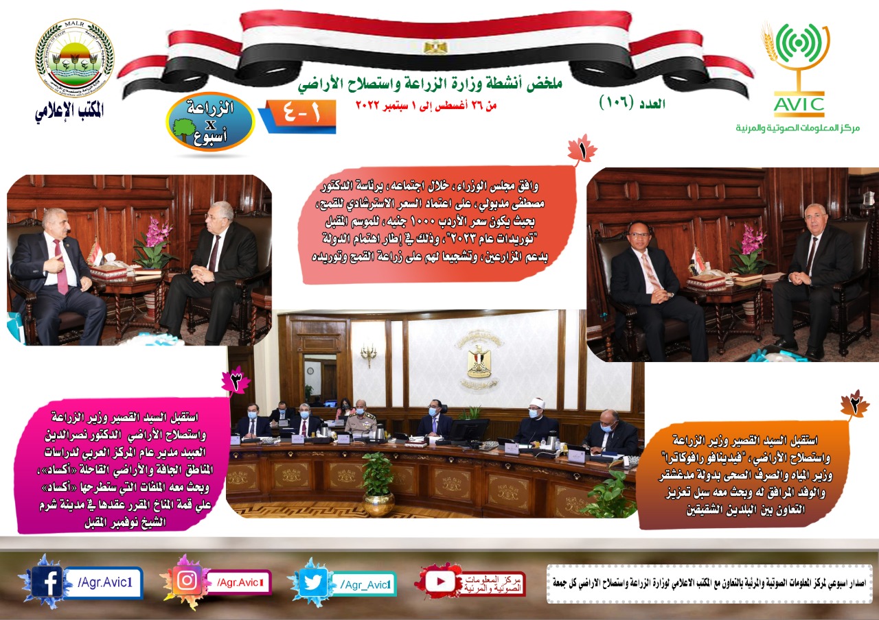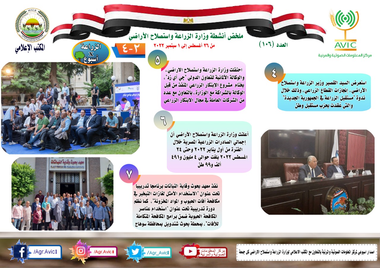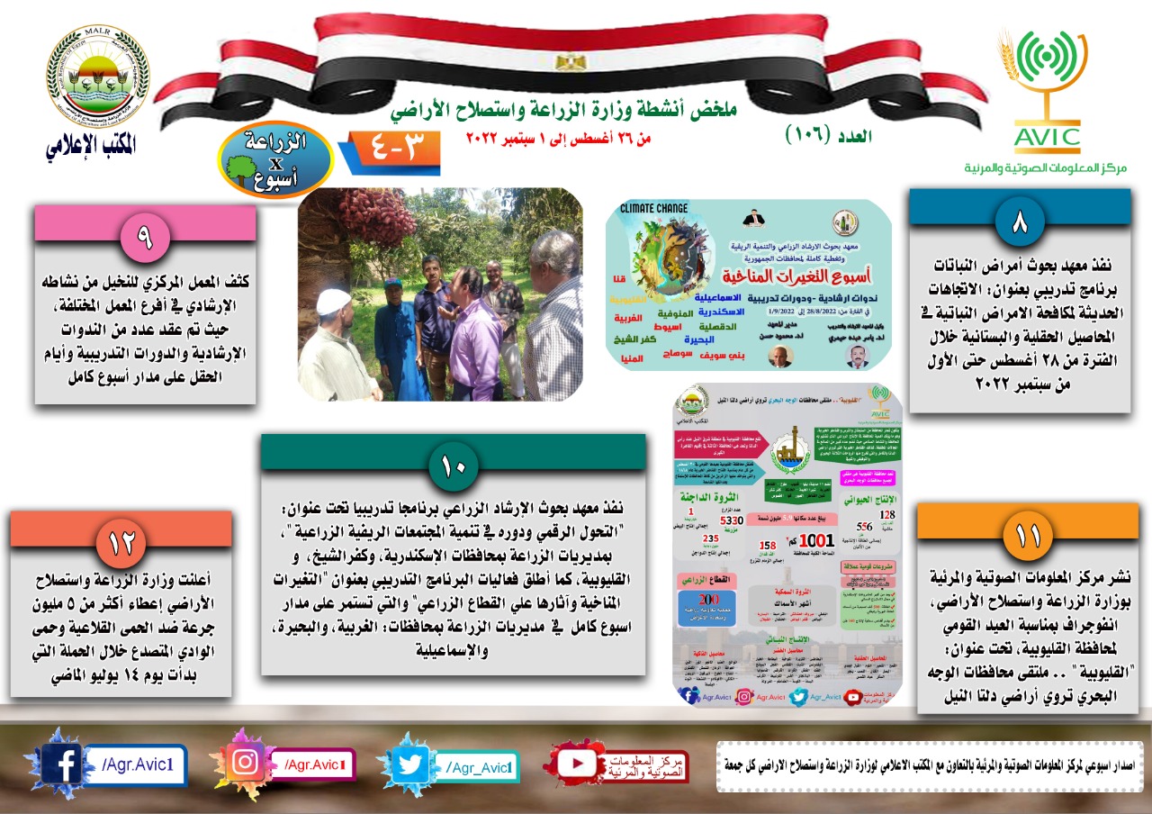 أصدر مركز المعلومات الصوتية والمرئية، التابع لـ وزارة الزراعة واستصلاح الأراضي، "الانفوجراف الأسبوعي" في نسخته رقم 106، حول الحصاد الأسبوعي لأهم أنشطة الوزارة، خلال الأسبوع الماضي في الفترة من 26 أغسطس حتى 1 سبتمبر الجاري، وذلك بالتعاون مع المكتب الإعلامي للوزارة.