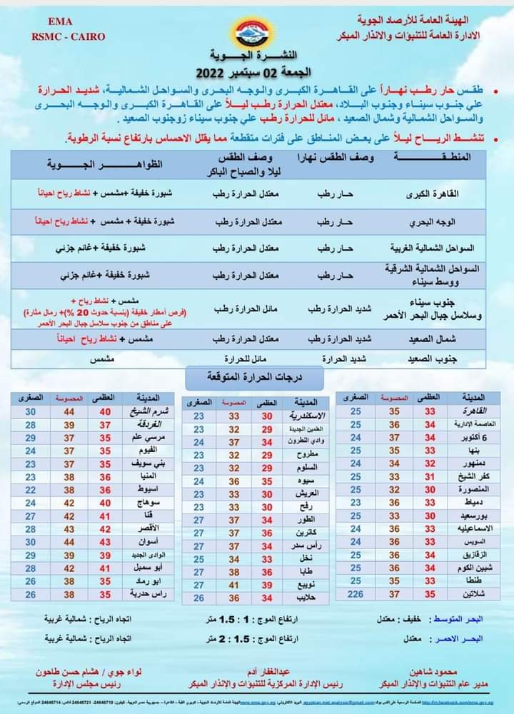 كشفت هيئة الأرصاد الجوية، تفاصيل حالة الطقس التي تشهد مصر اليوم الجمعة، الموافق 2-9-2022؛ حيث تسجل درجات الحرارة العظمى على القاهرة 33 درجة مئوية.