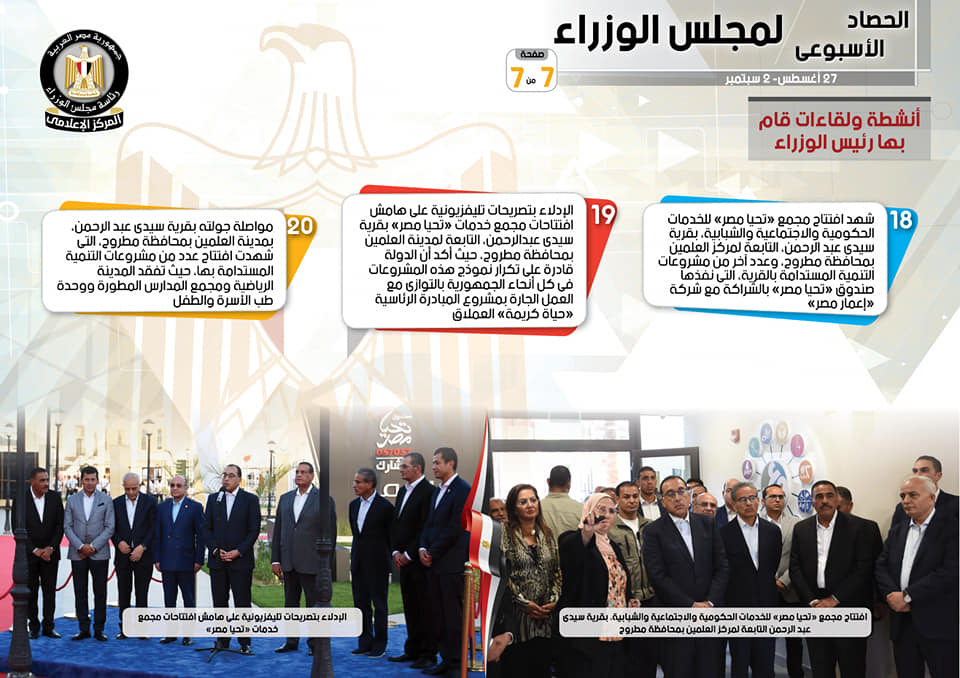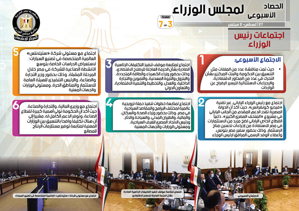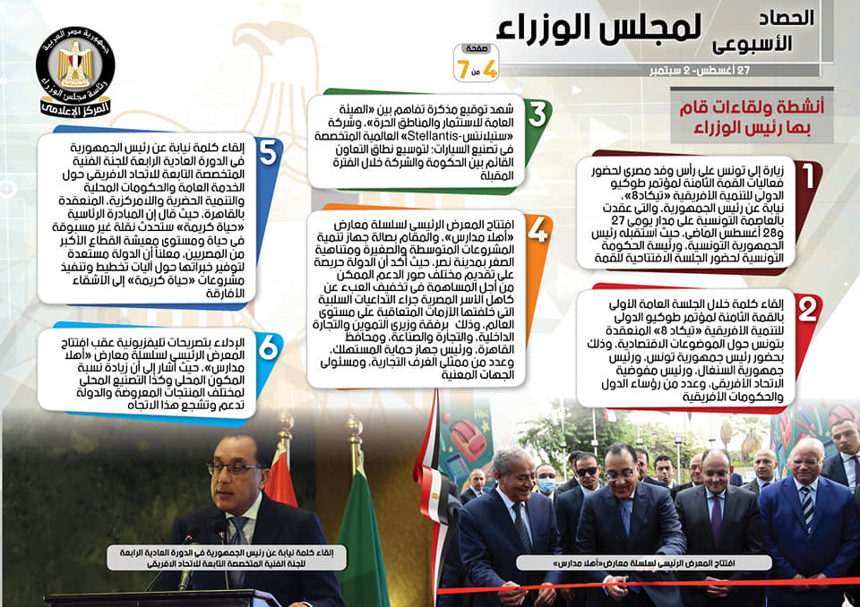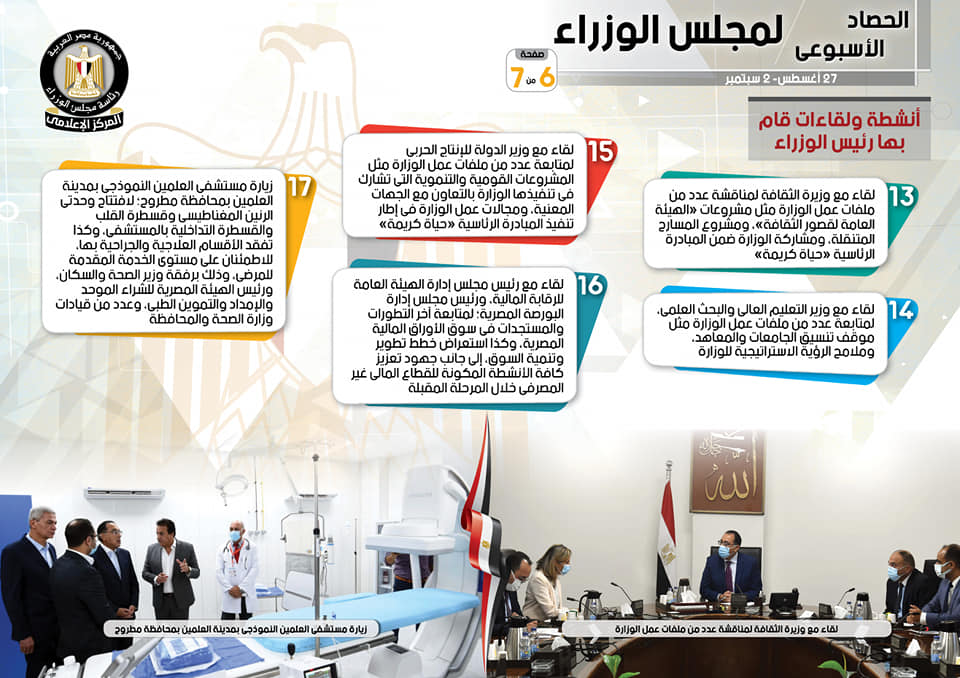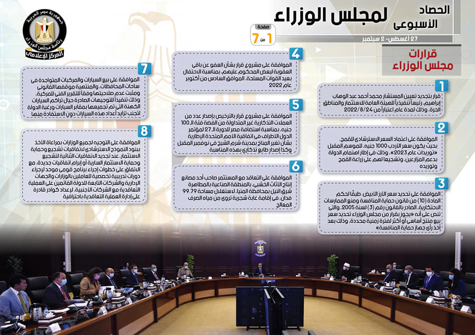 نشر المركز الإعلامي لـ مجلس الوزراء، تقريرًا شمل إنفوجرافات سلط من خلالها الضوء على الحصاد الأسبوعي لمجلس الوزراء، وذلك خلال الفترة من 27 أغسطس حتى 2 سبتمبر 2022، والذي تضمن الموافقة على عدد من القرارات، فضلًا عن الاجتماعات واللقاءات التي عقدها الدكتور مصطفى مدبولي، رئيس مجلس الوزراء، بالإضافة إلى ما نفذه من أنشطة.
