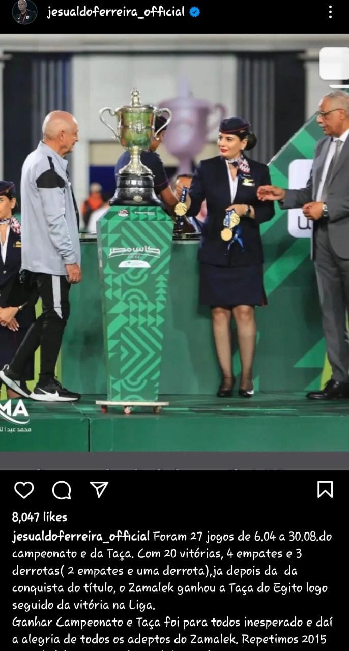 وقال البرتغالي فيريرا عبر حسابه على موقع التواصل الاجتماعي انستجرام: خضنا 27 مباراة حققنا خلالها 20 انتصارًا و4 تعادلات و3 هزائم منها واحدة بعد الفوز باللقب كما توجنا بكأس مصر.