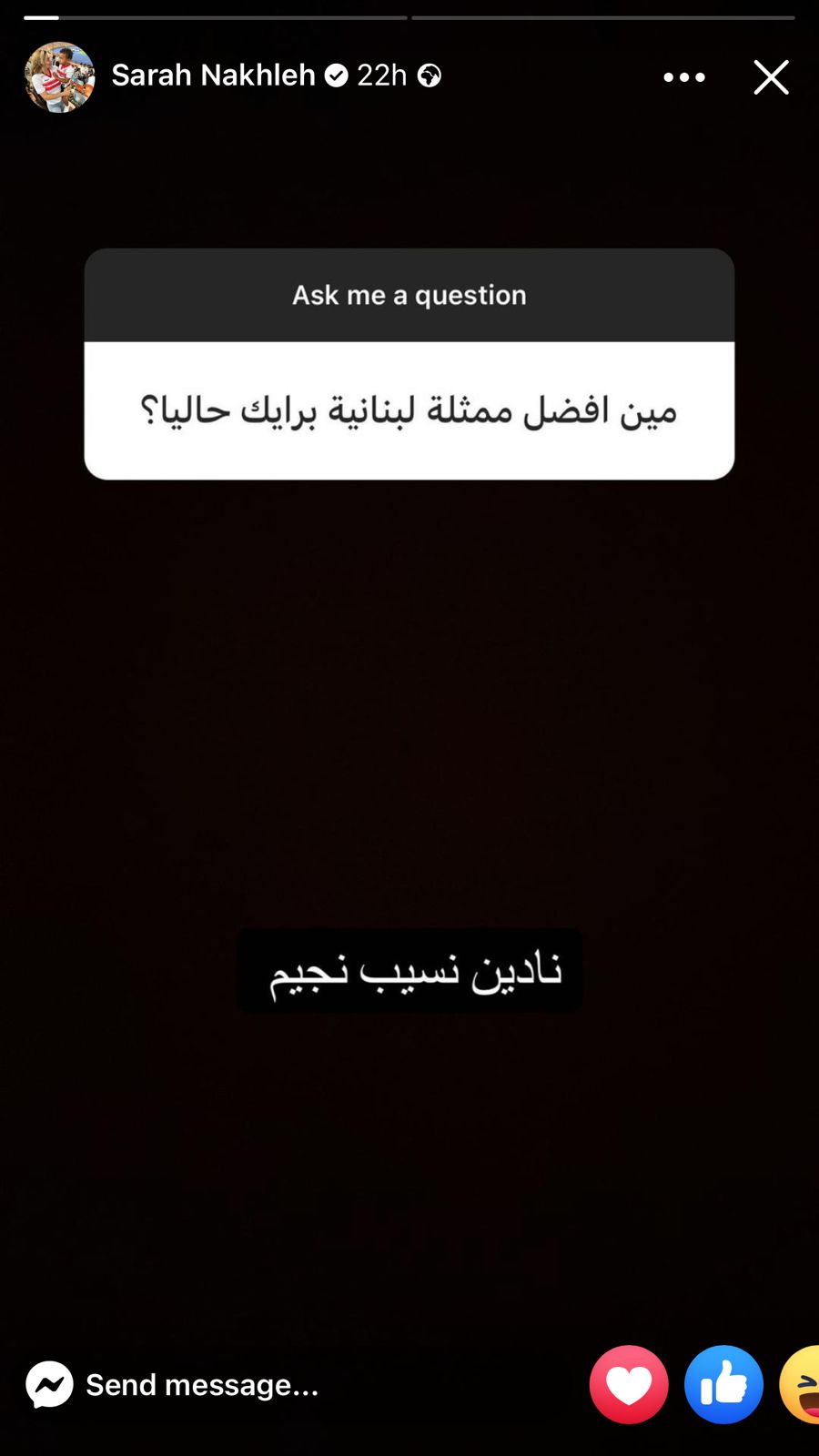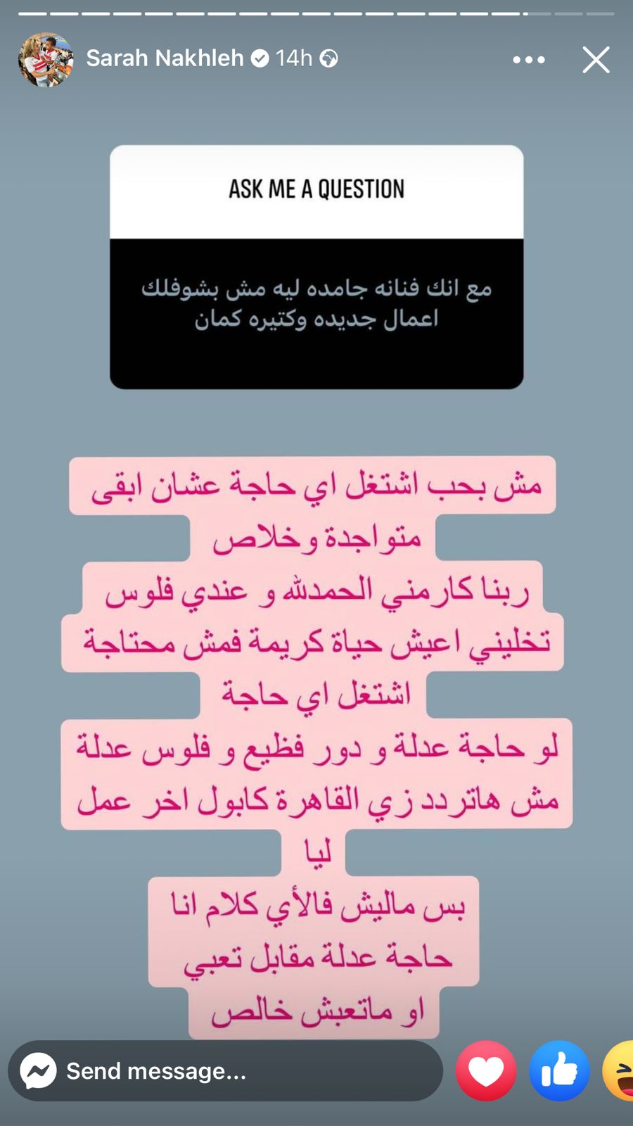 وكتبت سارة نخلة عبر خاصية ستوري على حسابها بموقع فيسبوك: مش بحب أشتغل أي حاجة عشان أكون متواجدة وخلاص.. ربنا كارمني الحمدلله وعندي فلوس تخليني أعيش حياة كريمة، وبالتالي مش محتاجة اشتغل أي حاجة.