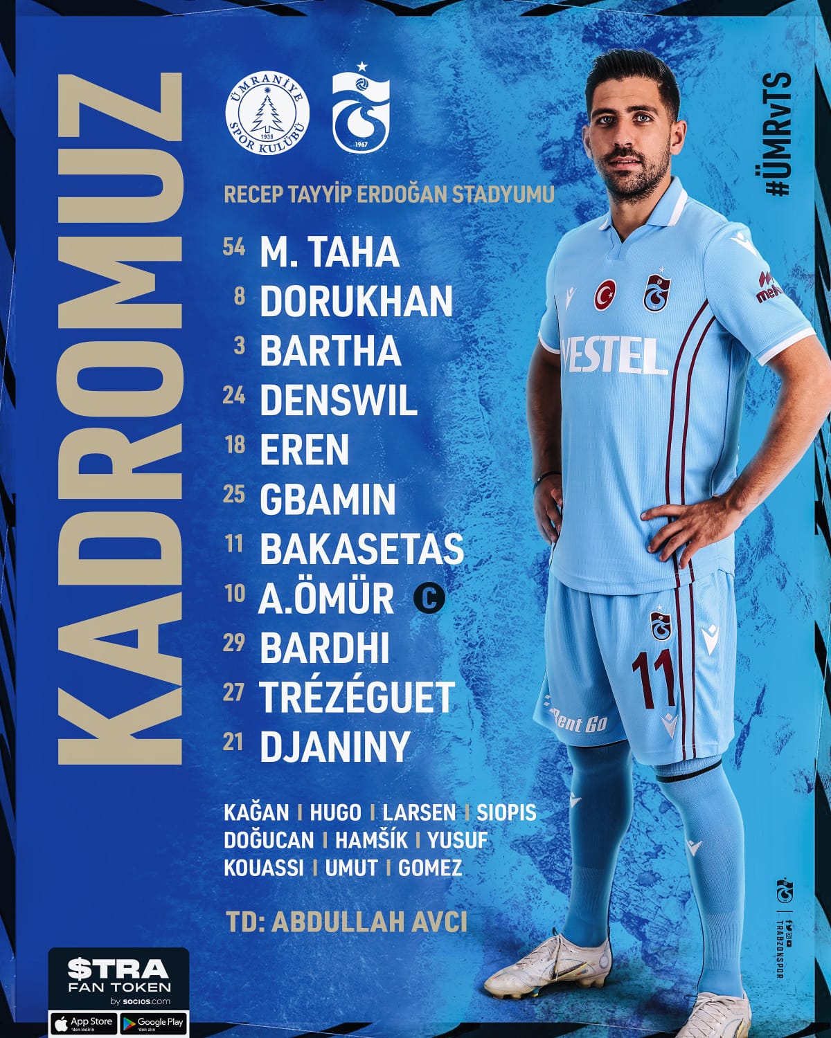 وقر المدرب التركي عبدالله آفجي، المدير الفني لـ طرابزون سبور، أن يدخل مباراة فريقه لمواجهة عمرانية سبور بتشكيل مكون من: -