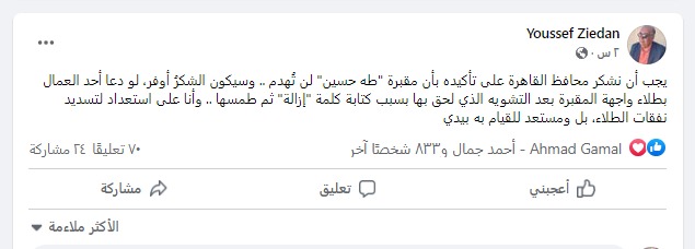 وقال زيدان خلال منشور له على صفحته الشخصية على موقع التواصل الاجتماعي فيسبوك: يجب أن نشكر محافظ القاهرة على تأكيده بأن مقبرة طه حسين لن تهدم، وسيكون الشكر أوفر، لو دعا أحد العمال بطلاء واجهة المقبرة بعد التشويه الذي لحق بها.