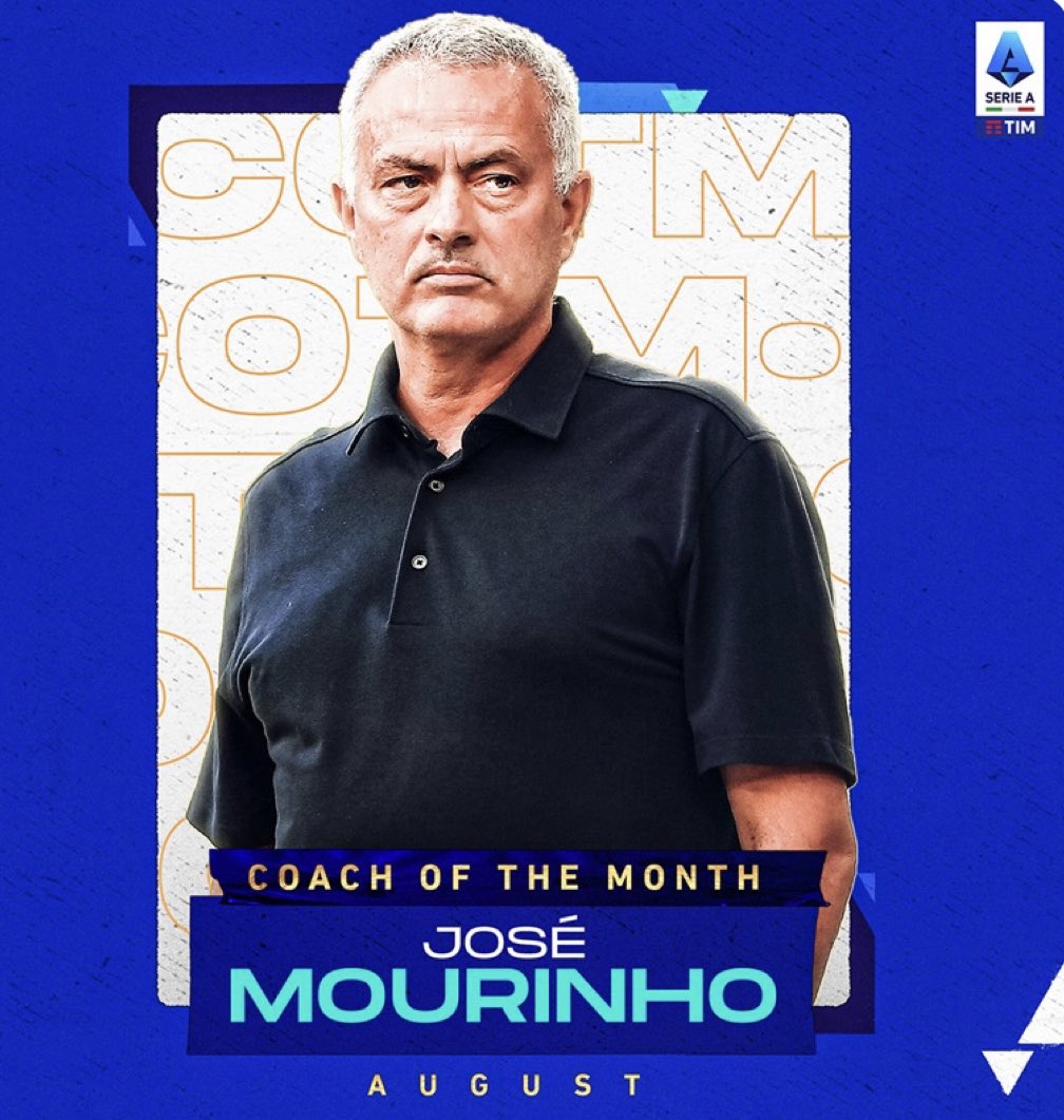 أعل الاتحاد الإيطالي لكرة القدم، فوز البرتغالي جوزيه مورينيو المدير الفني لفريق روما، بجائزة أفضل مدرب خلال شهر أغسطس.