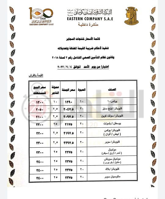 حصل القاهرة 24 على مستند رسمي لارتفاع أسعار السجائر بجميع أنواعها، حيث اعتمد مجلس إدارة الشركة الشرقية إيسترن كومباني، لائحة الأسعار الجديدة الخاصة بسعر البيع للمستهلك على منتجات الشركة من السجائر على أن يتم التطبيق اعتبارا من غدا الأحد الموافق 4 سبتمبر.