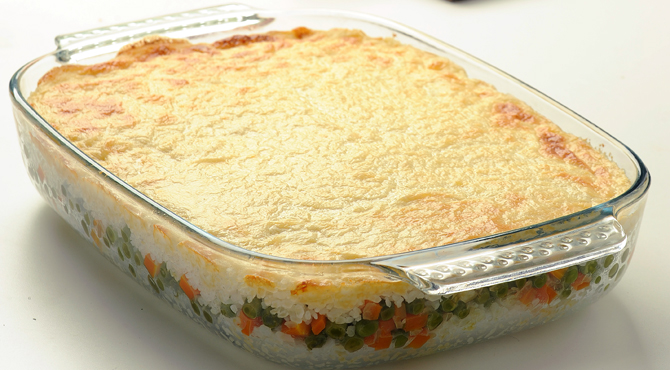 - صبي البشاميل فوق طبقات الأرز والخضار وأدخلي الصينية إلى الفرن الساخن مدة 15 دقيقة.