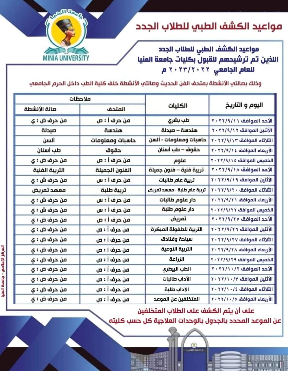 تعرف على مواعيد الكشف الطبي لطلاب جامعة المنيا المستجدين لهذا العام