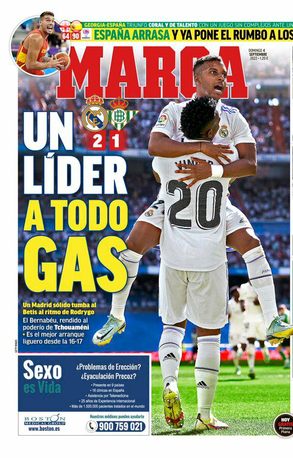 سلطت ماركا الضوء في غلافها اليوم على صدارة نادي ريال مدريد الإسباني لجدول ترتيب الليجا، حيث قالت إن الملكي يتصدر الترتيب بكامل طاقته، حيث نجح ريال مدريد في أن يقهر بيتيس على إيقاع رودريجو.
