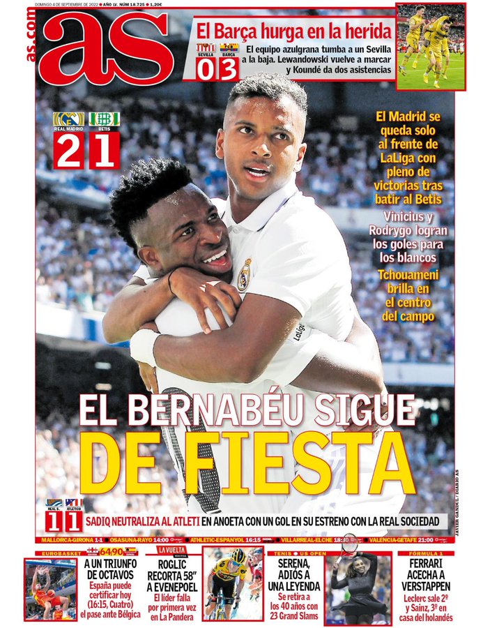 قالت صحيفة آس في غلافها لعدد اليوم، إن الاحتفالات مستمرة في البرنابيو، وذلك بعد الفوز أمس على ريال بيتيس بهدفين مقابل هدف.