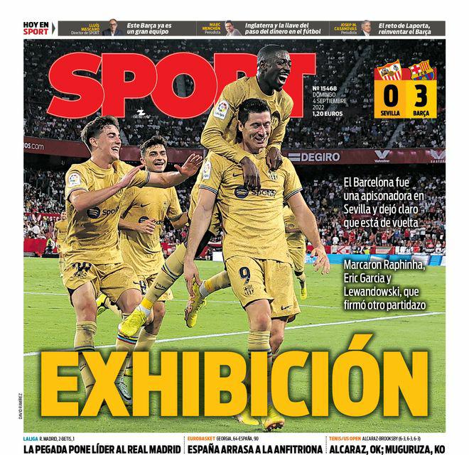 تصدر فوز فريق برشلونة أمس على نظيره إشبيلية غلاف صحيفة سبورت لعدد اليوم، وأشادت بتألق النادي الكتالوني، في إشارة إلى أنه يواصل السعي لصدارة الليجا.