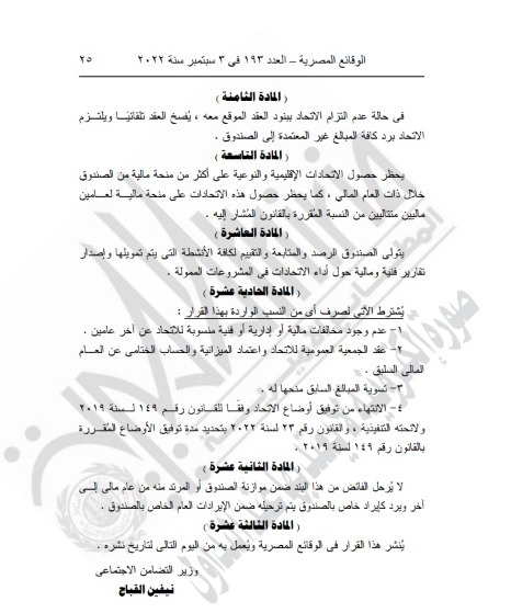 وأضاف القرار: على أن تراعي عند صرف النسبية المقررة والمخصصة للاتحادات النوعية والإقليمية الآتي 1- يعلن صندوق دعم مشروعات الجمعيات والمؤسسات الأهلية عن حجم التمويل المتاح للاتحادات الإقليمية والاتحادات النوعية والمنح المتاحة للاتحادات الموجة والإقليمية خلال الثلاثة أشهر الأولى من تاريخ انتهاء السنة المالية المقرر حساب النسبة المقررة عنها بموجب البند رقم (6) من المادة (8) من القانون رقم 149 لسنة 2019.
