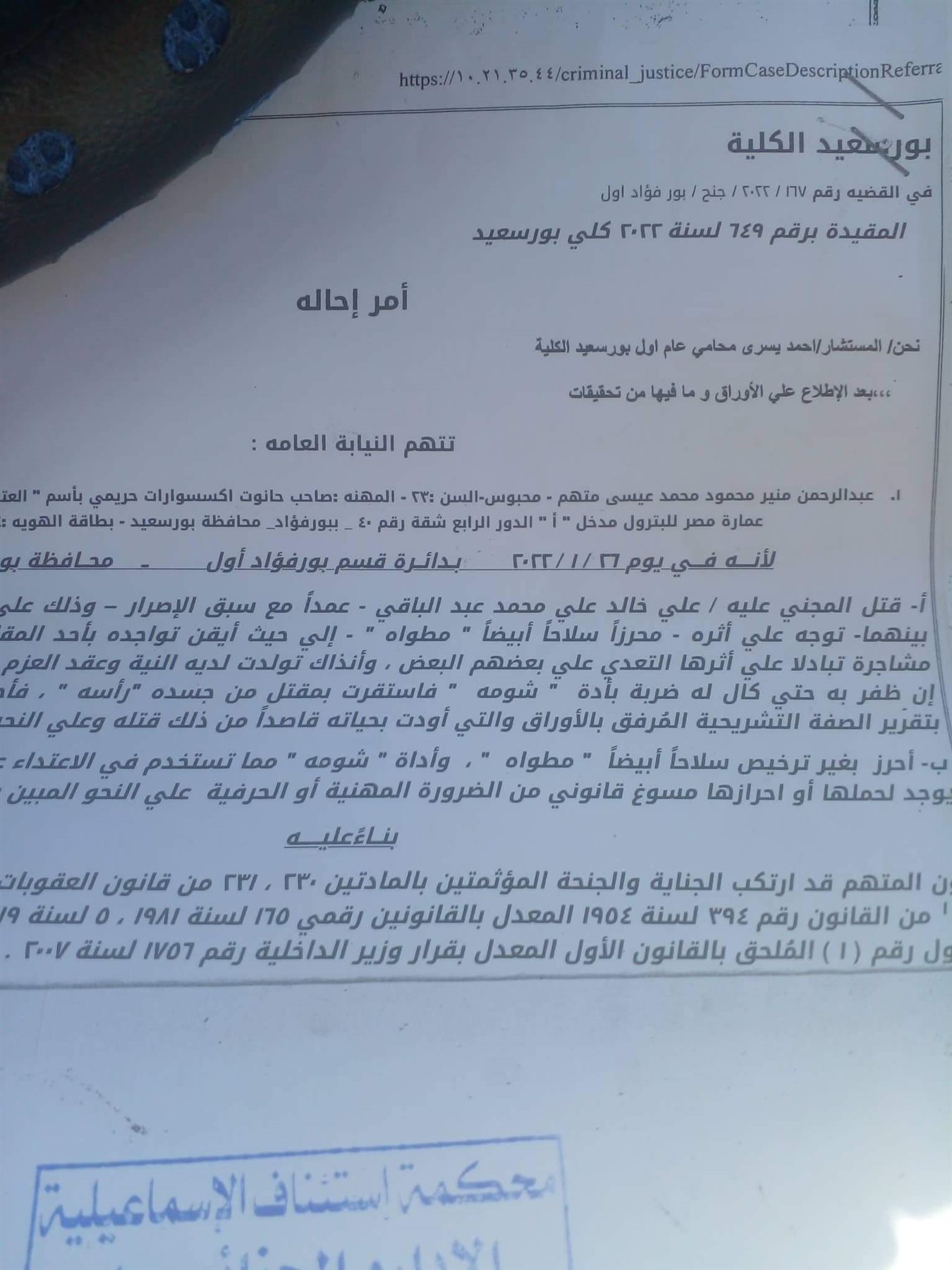 وأكدت نيابة بورسعيد الكلية، أن المتهم أحرز بدون ترخيص سلاحًا أبيضًا مطواه وشومة، وارتكب بذلك الجناية المؤثمة، وقتل علي خالد عبد الباقي، عمدًا مع سبق الإصدار، وعليه تم إحالته لمحكمة الجنايات.
