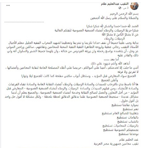 تقدم عبد الحليم علام النقيب العام للمحامين، بالشكر لجميع أعضاء الجمعية العمومية لنقابة المحامين، وذلك بعد فوزه بمقعد نقيب المحامين.