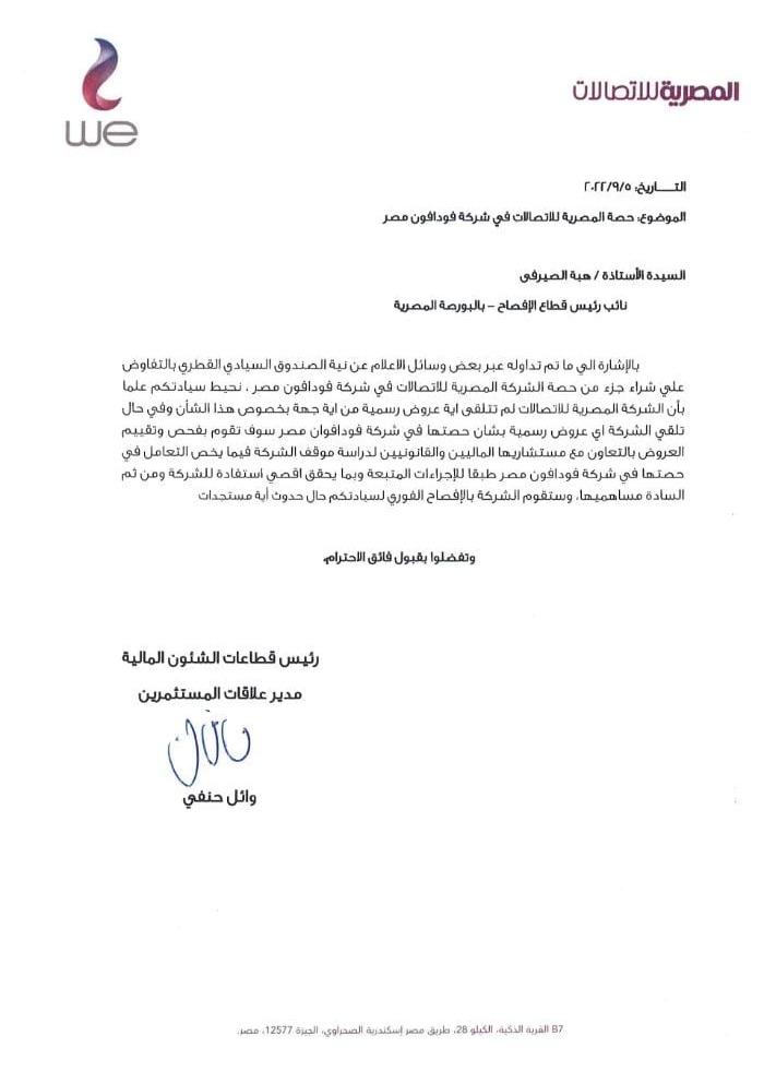 نفت المصرية للاتصالات، ما تم تداوله حول رغبة الصندوق السيادي الفطري بالتفاوض على شراء جزء من حصتها في شركة فودافون مصر.