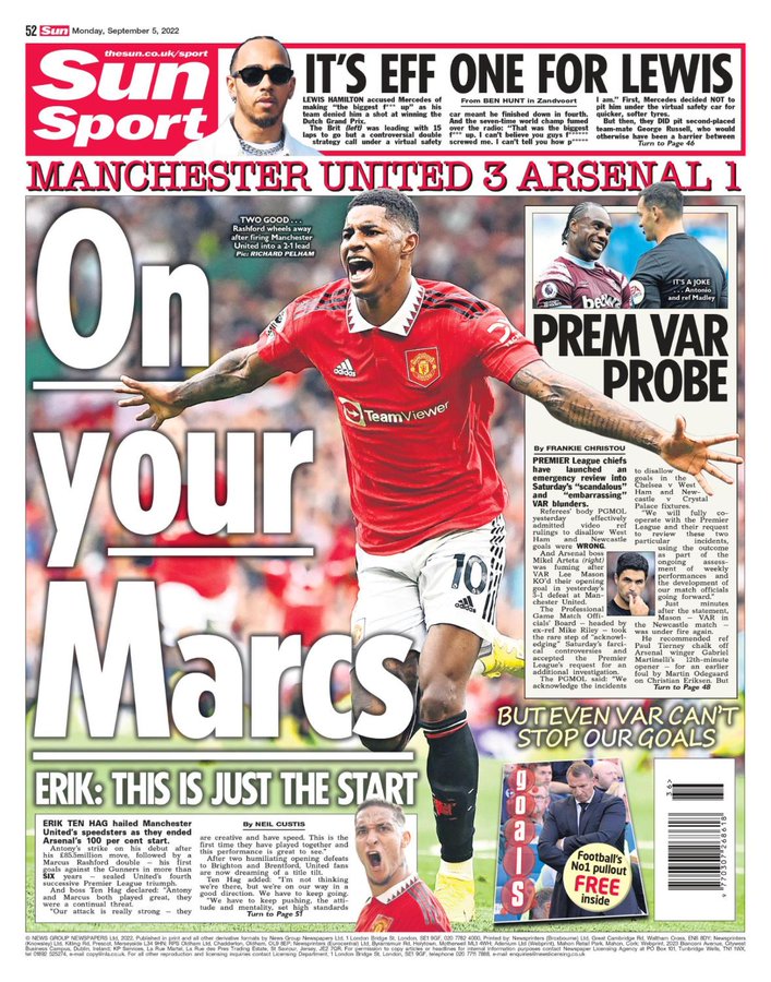 قالت صحيفة ذا صن في غلافها اليوم أن ماركوس راشفورد نجح في قيادة مانشستر يونايتد لفوز غالٍ على أرسنال بثلاثية مقابل هدف؛ ليضع بذلك فريق تين هاج في المقدمة بفوز رابع على التوالي.