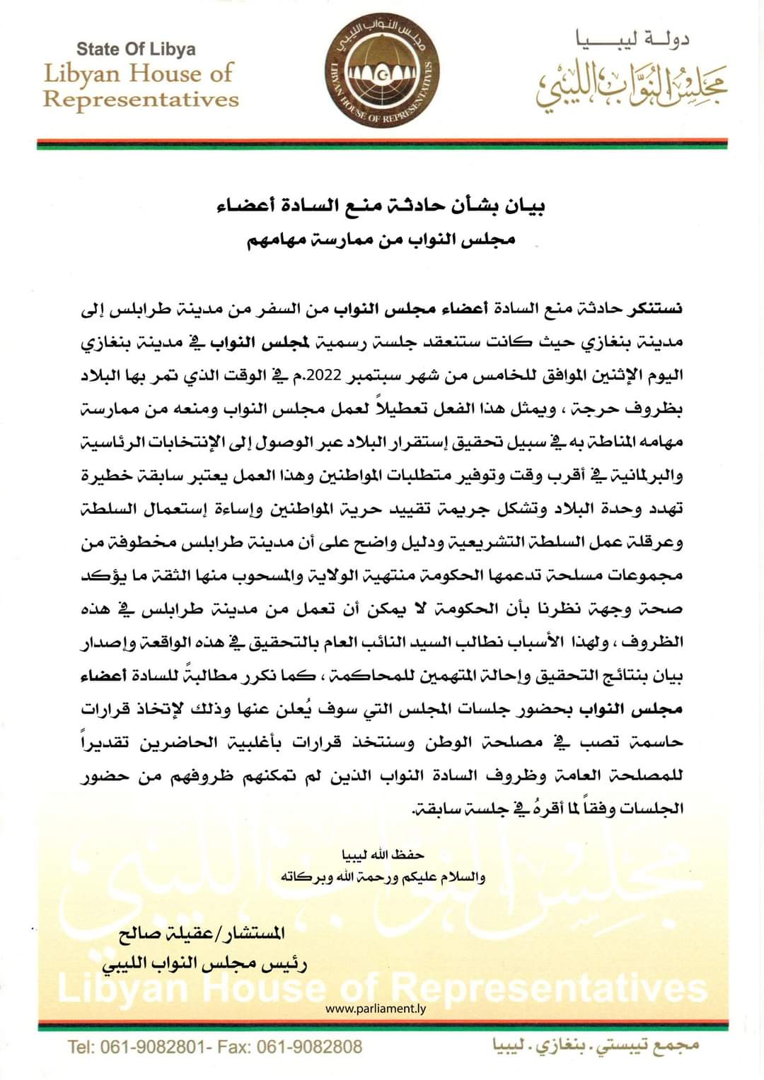 وأضاف مجلس النواب الليبي، في بيانه أن تلك الخطوات تؤكد وجهة نظر المجلس بأن الحكومة المكلفة لا يمكن أن تعمل من داخل طرابلس في الوقت الحالي.