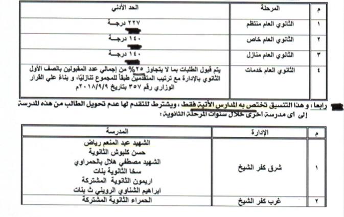 وافق اللواء جمال نور الدين، محافظ كفر الشيخ، على النزول بتنسيق القبول بمدارس التعليم الثانوي العام إلى 227 درجة نظام انتظام، و140 درجة للثانوي الخاص والمنازل، وذلك في استجابة لمطالب أولياء الأمور والطلاب، وتم تحديد مدارس بعينها لقبول الطلاب بها نظرا للكثافة بتلك المدارس في 12 إدارة تعليمية، وعددها 41 مدرسة، ويشترط عدم التحويل منها إلى أي مدرسة أخرى طوال فترة الدراسة.