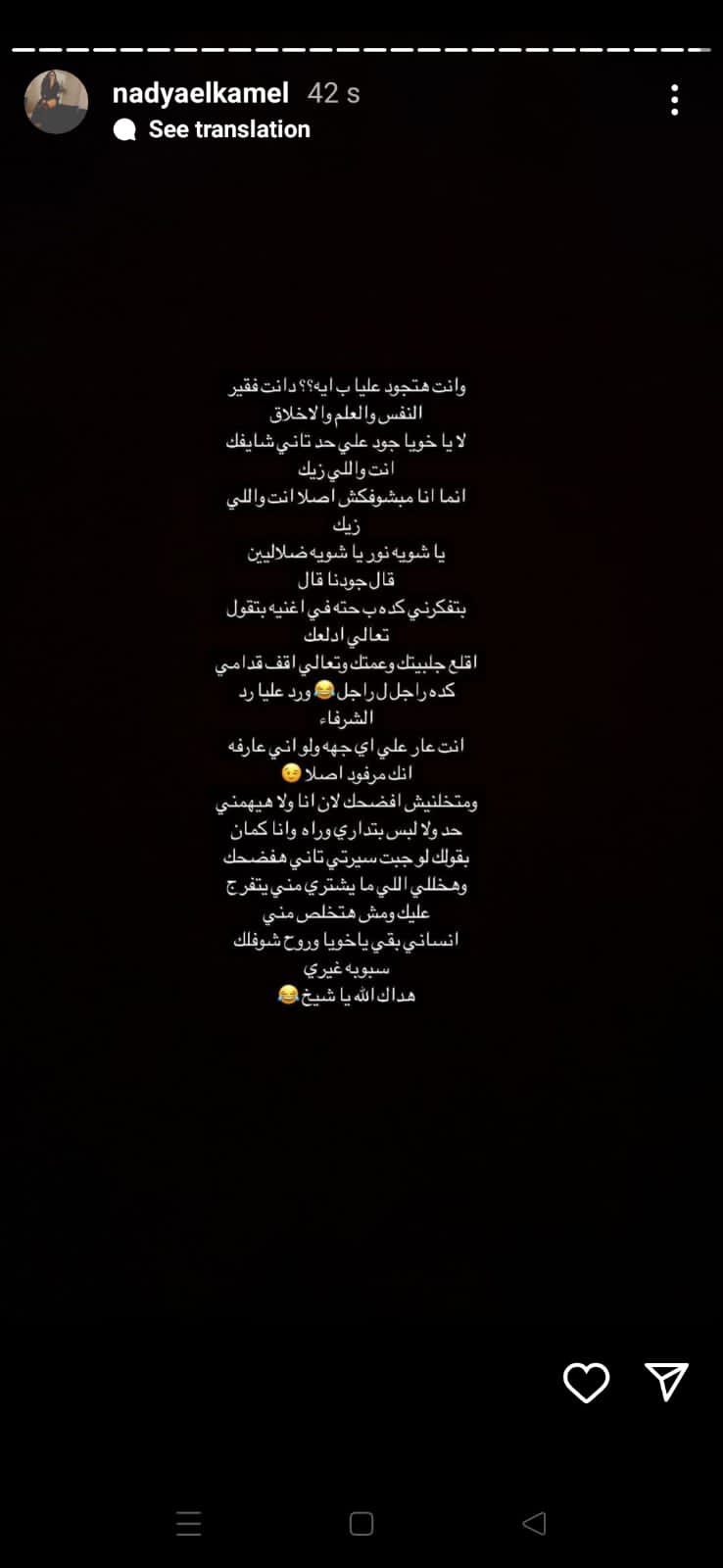 وللمرة الثانية.. فتحت ندى الكامل النار على مظهر شاهين، حيث كتبت عبر حسابها على انستجرام: أنت هتجود عليا بـ إيه؟ دا أنت فقير النفس والأخلاق لا يا خويا جود على حد تاني؛ لأني مش بشوفك إنت واللي زيك.. أقلع جلبيتك وعمتك وتعالى أقف قدامي كدا راجل لـ راجل ورد عليا رد الشرفاء.