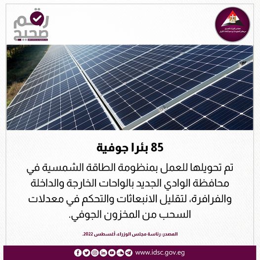 نشر مركز المعلومات التابع لمجلس الوزراء، انفوجراف، سلط الضوء من خلاله على عدد الآبار الجوفية التي تم تحويلها إلى العمل بمنظومة الطاقة الشمسية في محافظة الوادي الجديد، بالواحات الخارجة والداخلة والفرافرة؛ لتقليل الانبعاثات، والتحكم في معدلات السحب من المخزون الجوفي.