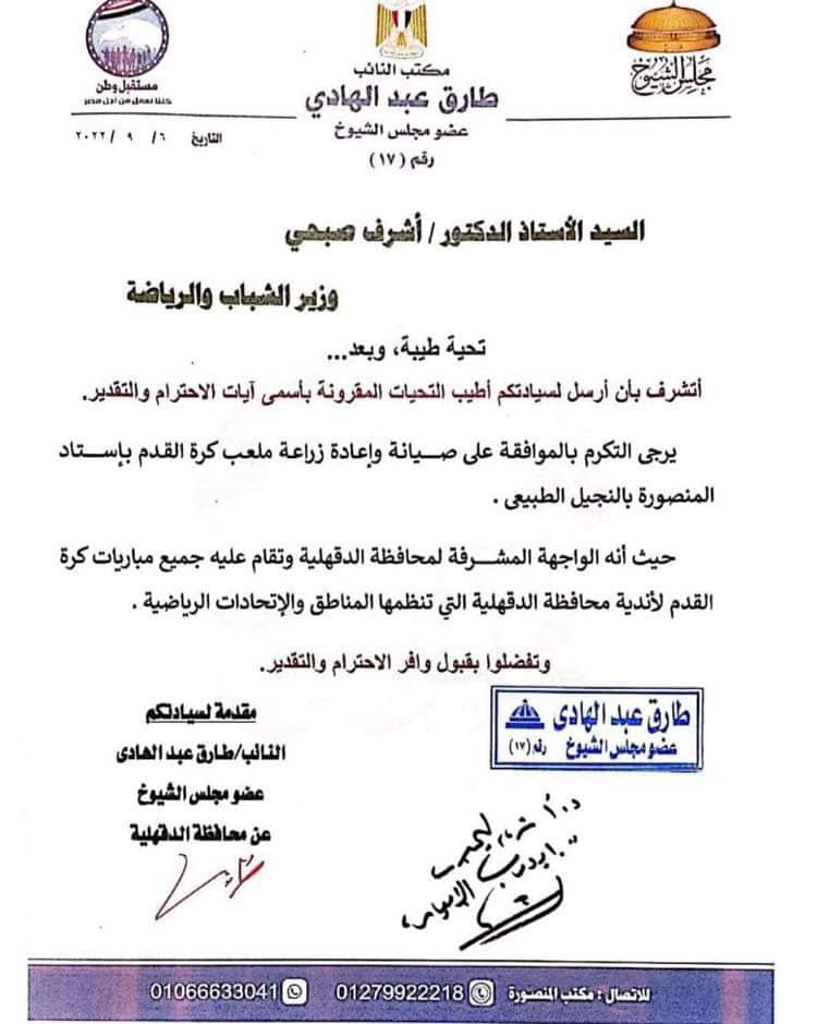 أرسل طارق عبدالهادي عضو مجلس الشيوخ، خطابًا إلى الدكتور أشرف صبحي وزير الشباب والرياضية، لبحث صيانة ملعب استاد المنصورة، الذي يستضيف مباريات الفريق الأول لكرة القدم بدوري الدرجة الثانية الموسم المقبل.