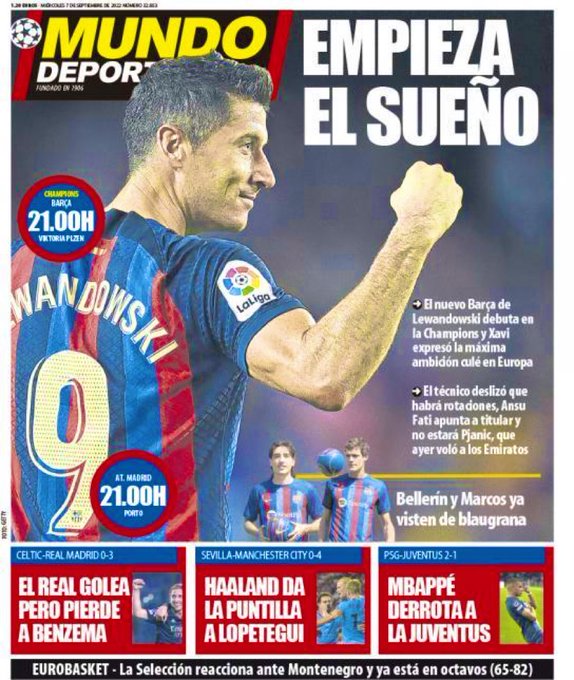 تصدر البولندي روبرت ليفاندوفسكي لاعب فريق برشلونة الإسباني، غلاف صحيفة موندو ديبورتيفو لعدد اليوم، وذلك في إشارة إلى أن النادي الكتالوني يحلم بتحقيق اللقب، ويبدأ اليوم مشواره نحو ذلك الحلم.