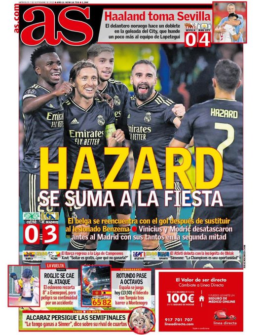 قالت صحيفة آس في غلافها لعدد اليوم، إن هازارد عاد إلى المجموعة، مشيرة إلى أن البلجيكي عاد إلى التسجيل مرة أخرى بعد استبدال المصاب كريم بنزيما.
