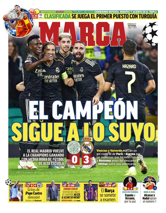 عنونت صحيفة ماركا في غلافها لعدد اليوم بـ البطل يواصل عاداته، حيث قالت إن ريال مدريد عاد إلى دوري الأبطال بفوز بعدما قدم نصف ساعة لعب بمستوى جيد في كرة القدم، كما ظهرت إصابة مقلقة لـ بنزيما، وتألق هازارد.