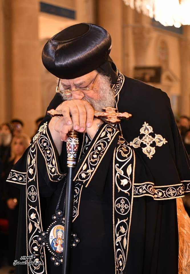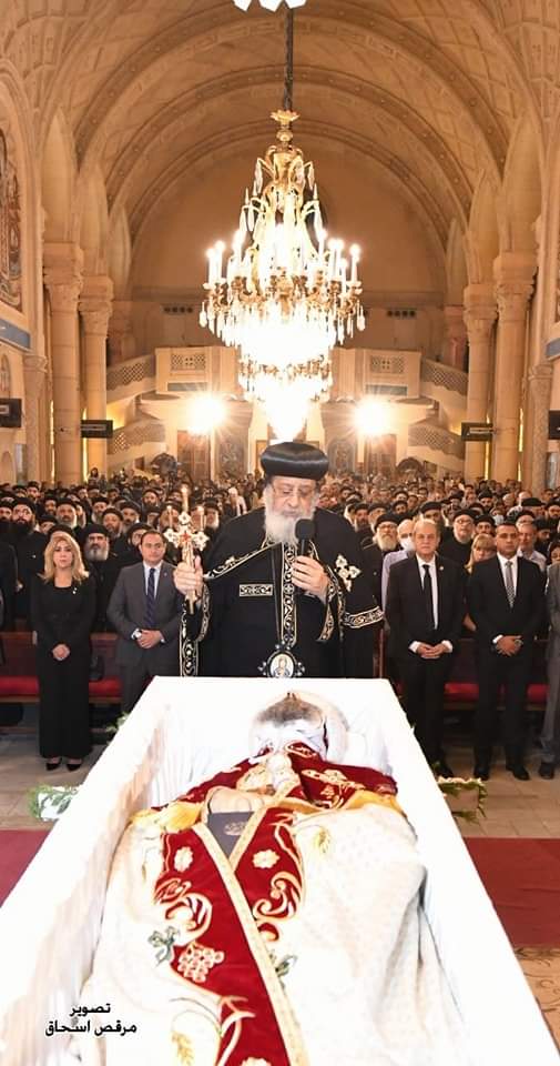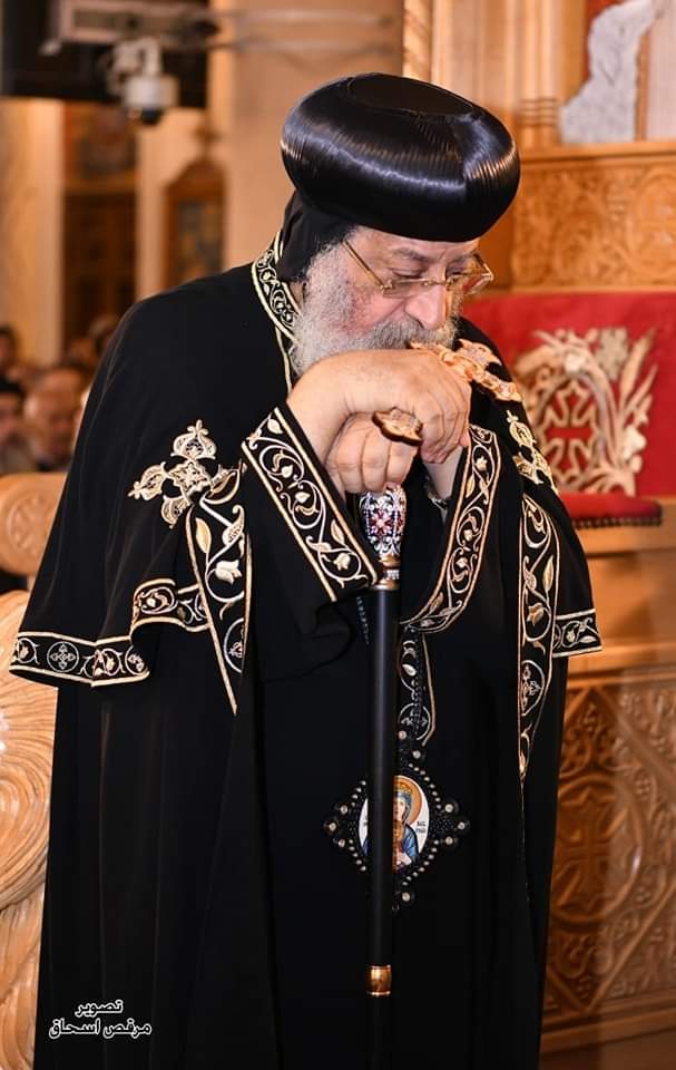 صلى قداسة البابا تواضروس الثاني في الثانية عشرة منتصف ظهر اليوم، صلوات تجنيز مثلث الرحمات المتنيح نيافة الأنبا إيساك الأسقف العام والأب الروحي لدير القديس مكاريوس السكندري بجبل القلالي في الكاتدرائية المرقسية بالإسكندرية.