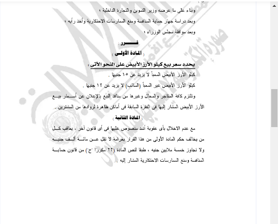 وشددت الجريدة الرسمية، على أن تلتزم كافة المتاجر والمحال وغيرها من منافذ البيع بالإعلان عن أسعار بيع الأرز الأبيض المشار إليها في الفقرة السابقة في أماكن ظاهرة لروادها من المشترين.