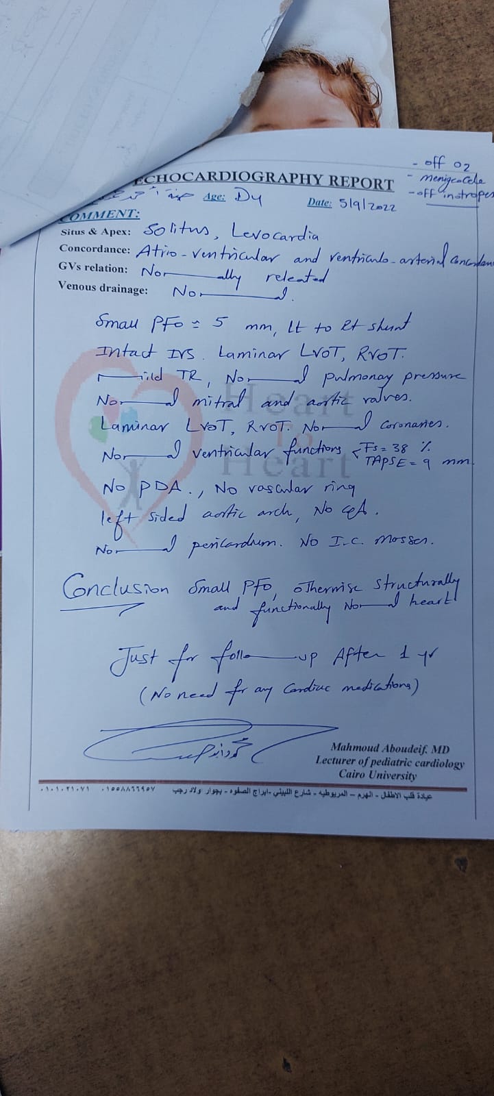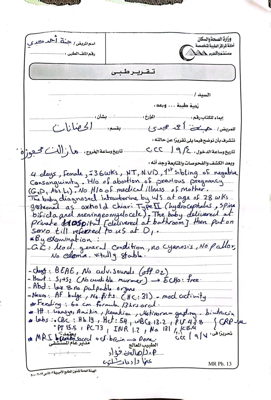 وواصل مجدي: عملت أشعة رنين وإيكو على القلب، ومقطعية، والدكاترة قالوا أنها محتاجة عملية جراحية ضروري، لأن الضفيرة العصبية للعمود الفقري غير مكتملة.