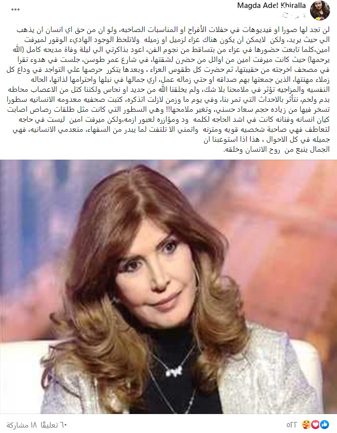 وتابعت ماجدة خير الله حديثها بموقف رأته للفنانة ميرفت أمين بعزاء الفنانة مديحة كامل، قائلة: كلما تابعت حضورها في عزاء من يتساقط من نجوم الفن،أاعود بذاكرتي إلى ليلة وفاة مديحة كامل الله يرحمها، حيث كانت ميرفت أمين من أوائل من حضرن لشقتها، في شارع عمر طوسن، جلست في هدوء تقرأ في مصحف اخرجته من حقيبتها، ثم حضرت كل طقوس العزاء، وبعدها يتكرر حرصها على التواجد في وداع كل زملاء مهنتها، الذين جمعتها بهم صداقة أو حتى زمالة عمل، أرى جمالها في نبلها واحترامها لذاتها، الحالة النفسية والمزاجية تؤثر في ملامحنا بلا شك.