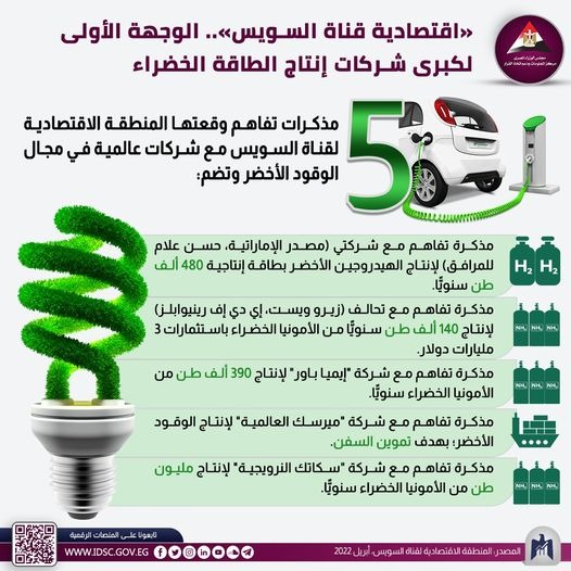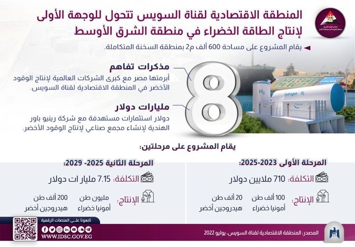 وذكر المركز الإعلامي لمجلس الوزراء، أن المنطقة الاقتصادية لقناة السويس، تعد من أهم الوجهات العالمية للاستثمار في الوقت الحالي ومقصدًا مهما لكبرى الشركات العالمية العاملة في المجالات المختلفة، وعلى رأسها الوقود الأخضر؛ سعيا نحو كونها واحدة من أهم المناطق الاقتصادية واللوجستية والصناعية على مستوى العالم، وقد أنفقت مصر خلال الفترة الأخيرة عشرات المليارات لتطوير البنية التحتية مثل المواني والمناطق الصناعية.