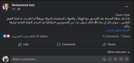 وكتب النائب محمود عبد العزيز، عضو لجنة العفو الرئاسي، عبر صفحته على فيسبوك: غدا بعد صلاة الجمعة، وبعد التنسيق مع الهيئات والجهات المختصة بالدولة، ووفقًا لما تقدمت به لجنة العفو الرئاسي.. سيتم باكر إن شاء الله، إخلاء سبيل عدد من المحبوسين احتياطيًا؛ بعد إصدار النيابة العامة قرارها بذلك.