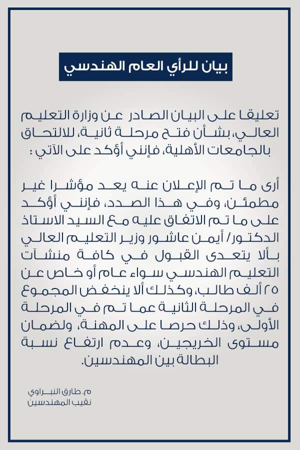 علق المهندس طارق النبراوي، نقيب المهندسين، على البيان الصادر من وزارة التعليم العالي، بشأن فتح مرحلة ثانية، للالتحاق بالجامعات الأهلية.
