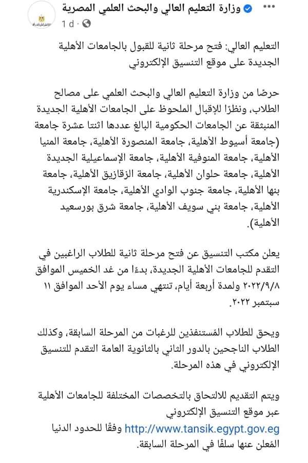 فتح مرحلة ثانية للالتحاق بالجامعات الأهلية