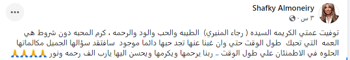 وكتبت شافكي المنيري عبر حسابها الشخصي على موقع التواصل الاجتماعي، فيسبوك: توفيت عمتي الكريمة السيدة رجاء المنيري الطيبة، والحب والود والرحمة وكرم المحبة دون شروط، هي العمة التي تحبك طول الوقت حتى وإن غبنا عنها تجد حبها دائمًا موجود.. سأفتقد سؤالها الجميل ومكالماتها الحلوة في الاطمئنان عليّ طول الوقت.. ربنا يرحمها ويكرمها ويحسن إليها يا رب ألف رحمة ونور.