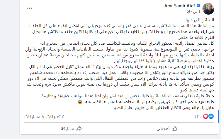 واختتم عمر سمير عاطف حديثه كاتبًا: حاجة حلوة بتعلي سقف المنافسة وبتخليك تحس ان فيه أمل وأن إحنا عندنا مواهب حقيقية وعظيمة، طبعا فيه عنصر أخير كان كويس برضه بس أنا مخاصمه فمش ها اتكلم عنه، هايل يا رجالة وفي انتظار الحلقتين اللي جايين بفارغ الصبر.